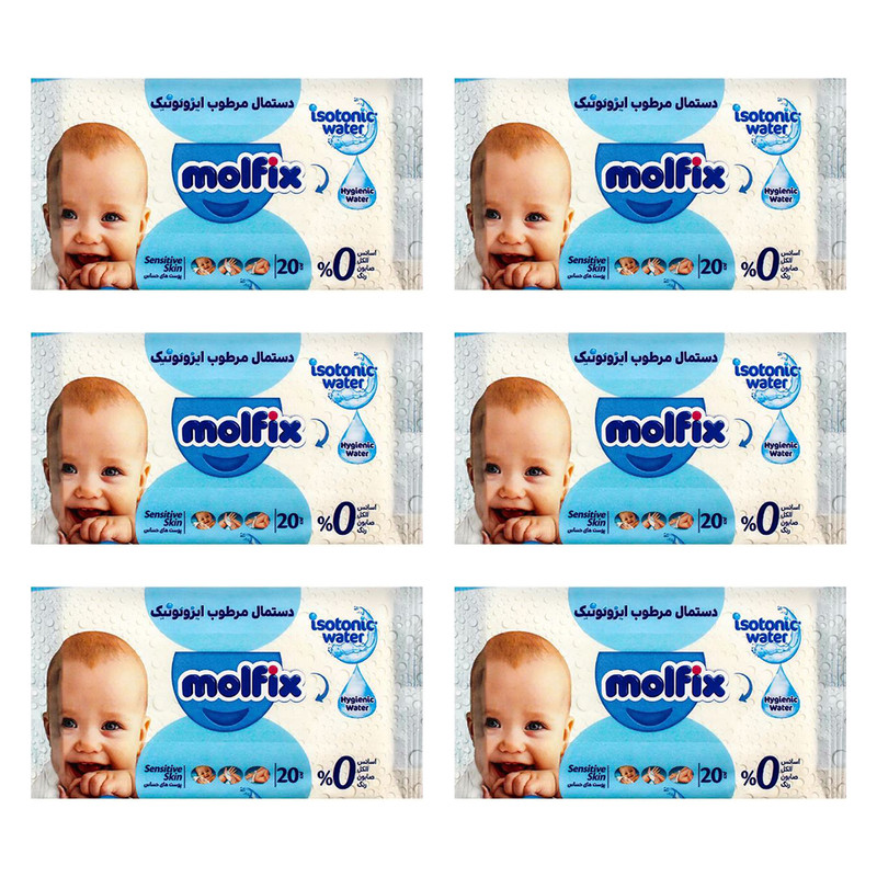 دستمال مرطوب کودک مولفیکس مدل ایزوتونیک شش مجموعه 20 عددی