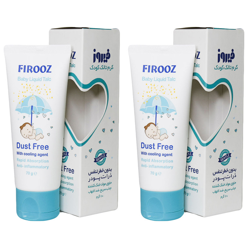 کرم تالک خنککننده، همان پودر بچه فیروز است که مضرات استنشاق پودر را ندارد. این محصول با ایجاد یک لایه بر روی پوست، از اصطکاک پوستی جلوگیری کرده و با جذب رطوبتاضافی مانعی برای عرقسوز شدن پوست حساس کودک میباشد. این محصول شرکت فیروز علاوه بر استفاده برای کودکان برای استفاده بزرگسالان نیز مناسب است. کرم تالک کودک فیروز حاوی د-پانتنول و آلانتوئین با خاصیت ضدالتهابی، تسکیندهندگی و نرمکنندگی پوست، خنککننده پوست نیز میباشد. استفادهی مداوم از این کرم برای کودک، نه تنها از ملتهب شدن پوست و قرمزی آن جلوگیری میکند، بلکه پوست را نرم و لطیف نگه میدارد.
