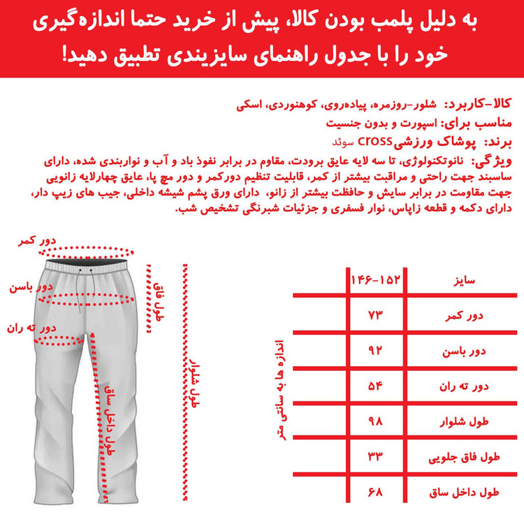 کالا دارای بسته بندی پلمب میباشد لذا قبل از خرید به جدول سایزبندی توجه نمایید و تطابق دهید. این محصول مناسب افرادیست که شلوار بسیار گرم نیاز دارند.