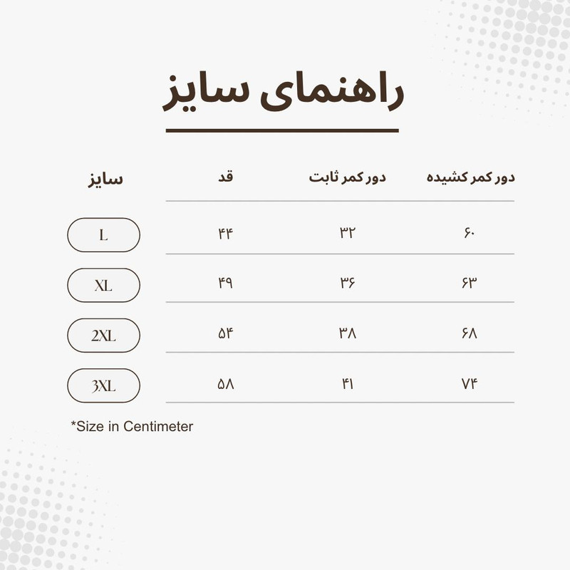 قد: L:44cm . XL:49cm . XXL:54cm . 3XL:58cm دور کمر در حالت ثابت: L:32cm . XL:36cm . XXL:38cm . 3XL:41cm دور کمر در حالت کشیده شده: L:60cm . XL:63cm . XXL:68cm . 3XL:74cm