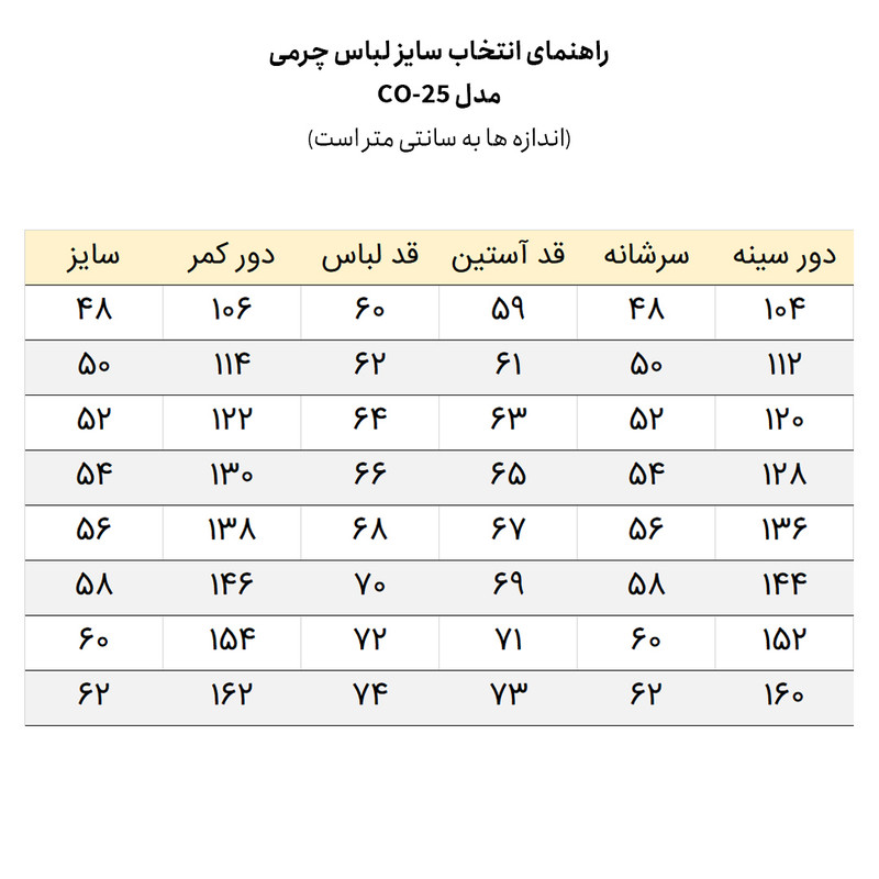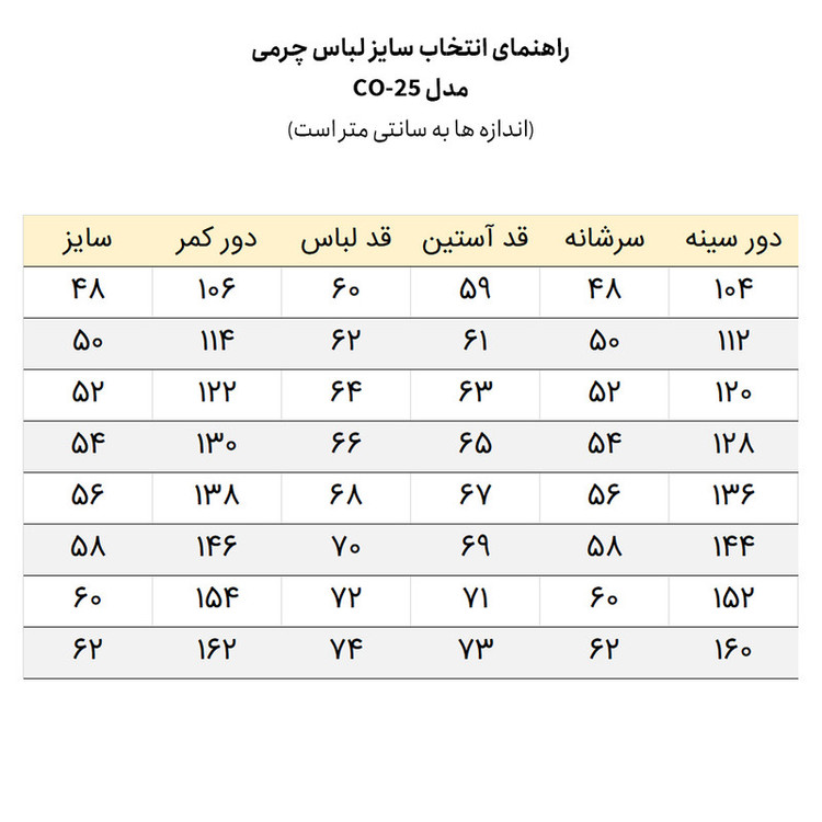 کت چرم CO-25 از چرم طبیعی گوسفندی سورت A مخصوص لباس، تولید شده است. آستر کشی ظریف با آستر پارچه ای سارج کره ای و جنس لطیف رویه و استفاده از یراق با کیفیت، به ارزش خرید این محصول افزوده است.