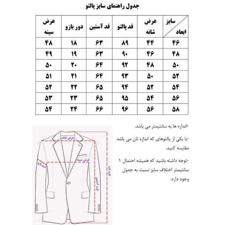 - 6 دراپ - ابعاد لباس برای سایز 48 : قد پشت لباس برابر با 82 سانتیمتر عرض سینه برابر با 52 سانتیمتر اندازه یقه تا سرشانه برابر با 16 سانتیمتر طول آستین برابر با 63 سانتیمتر