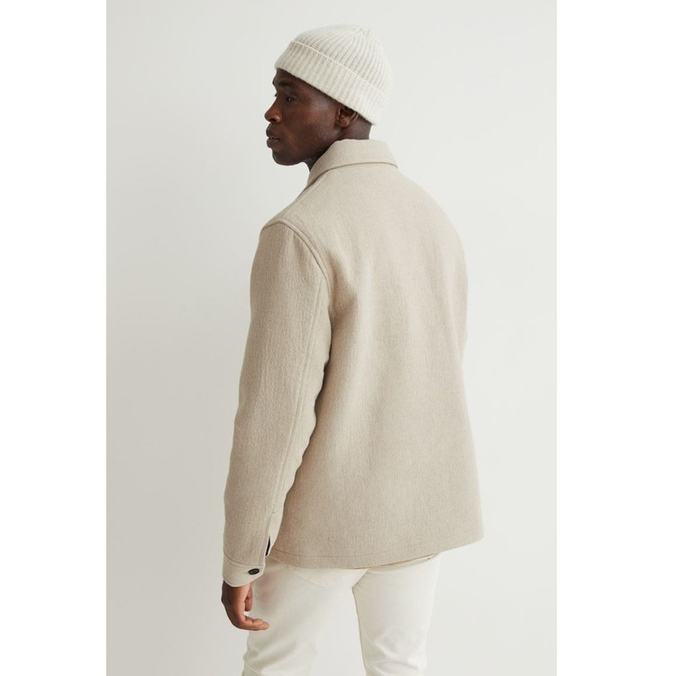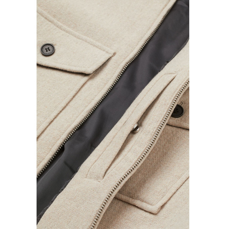کت در ترکیب پشم نمدی با یقه و زیپ جلو. آستین بلند با چاک و سرآستین دکمه دار. جیب سینه و دکمه و یک جیب داخل با دکمه گیر. سجاف راست.
