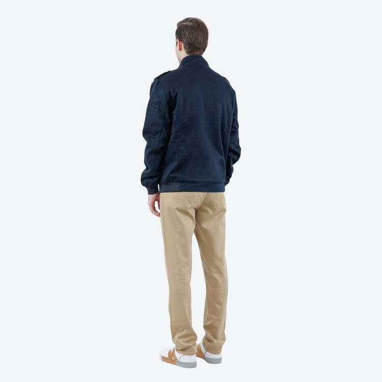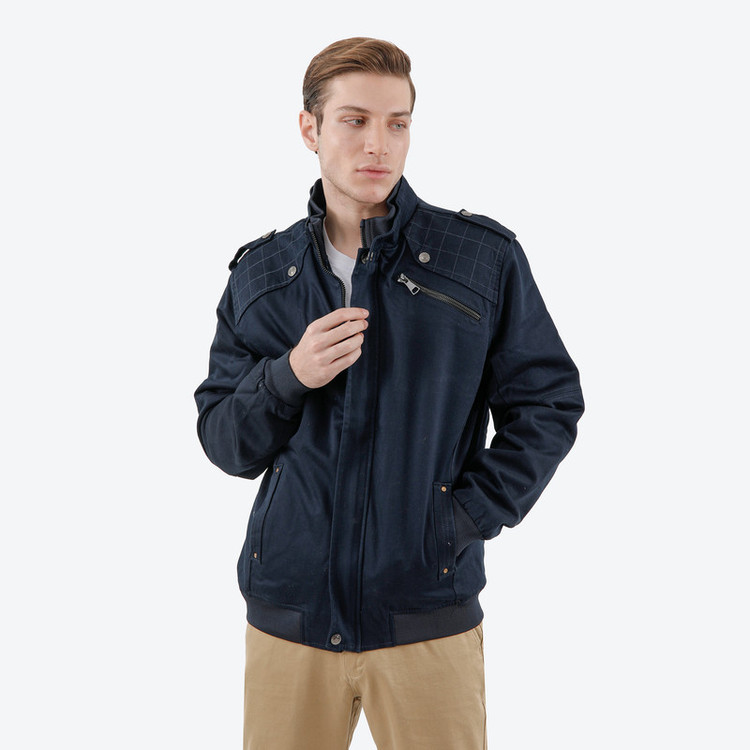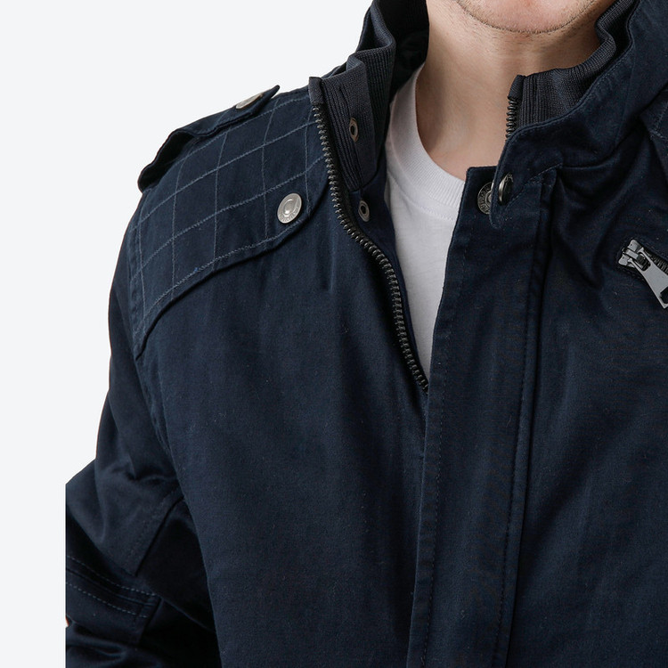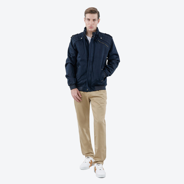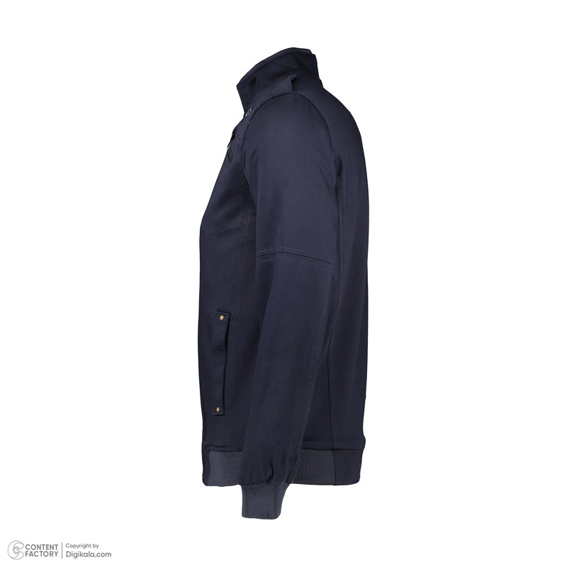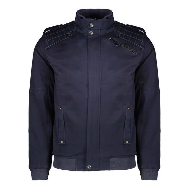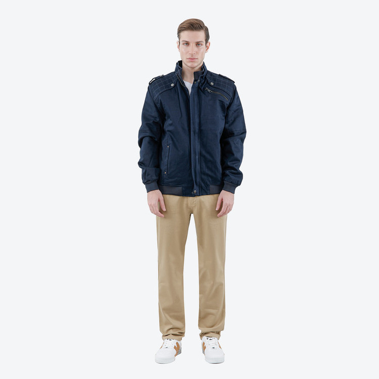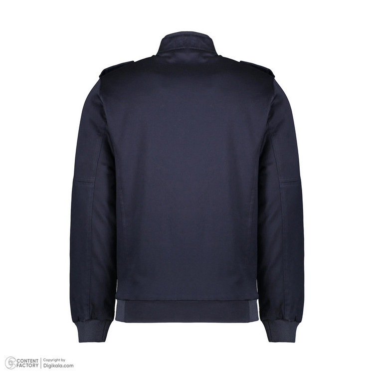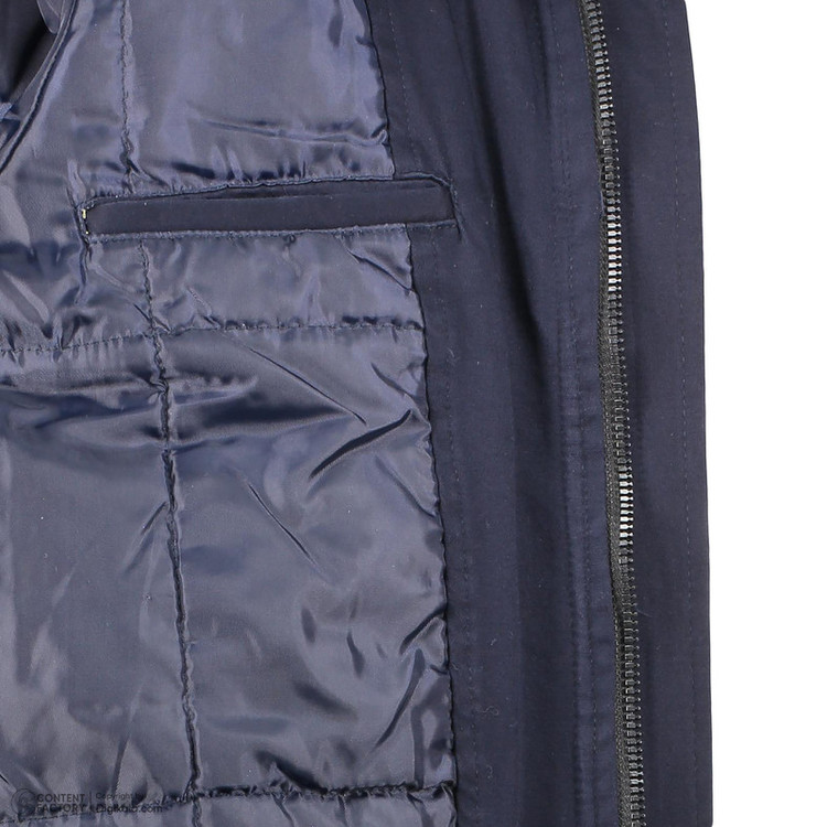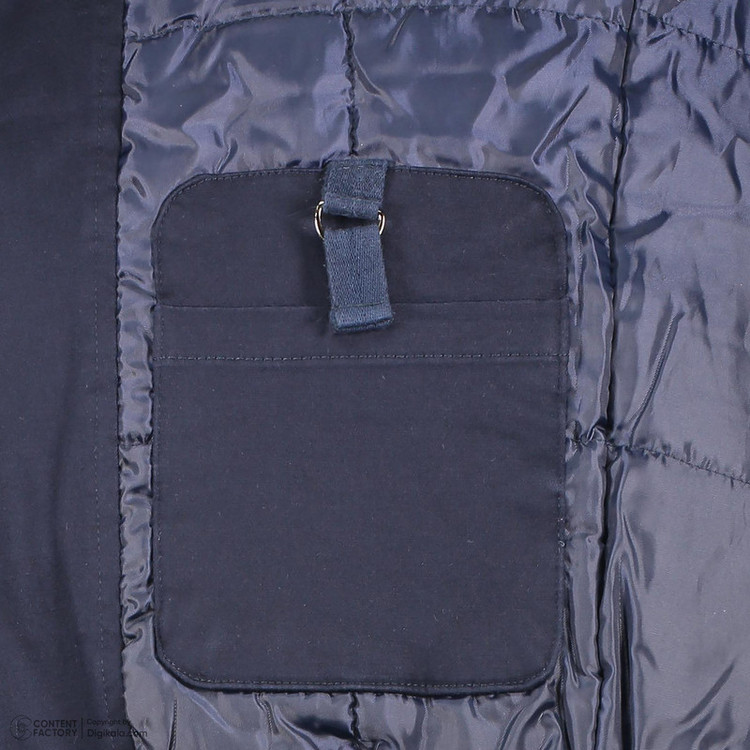 دو یقه کتان و کشبافت / دو جیب جانبی + دو جیب داخلی / تک جیب زیپدار روی قسمت بالای سینه / رنگ سرمه ای