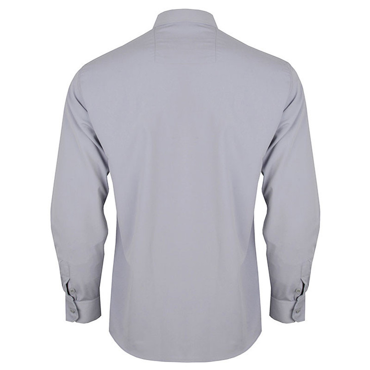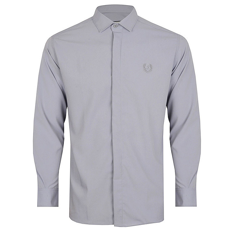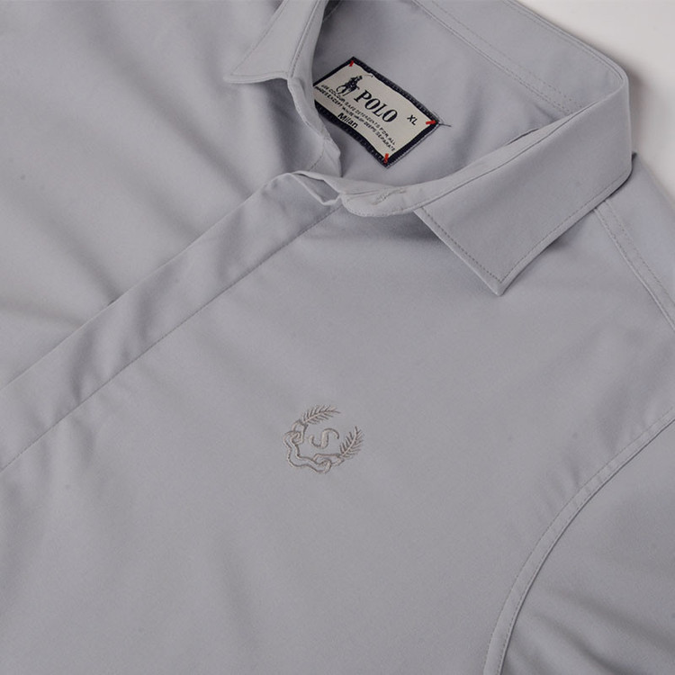 پیراهن مردانه جنس نخی ویسکوز آستین بلند لوگوی گلدوزی شده قد لباس تا روی باسن تن خور اسلیم پیراهن دکمه مخفی طرح پارچه ساده