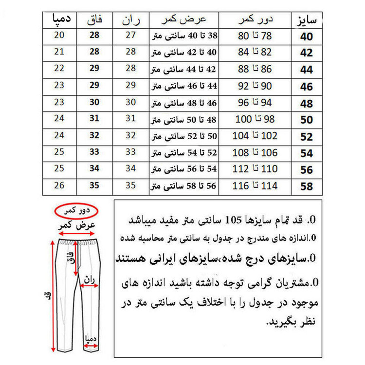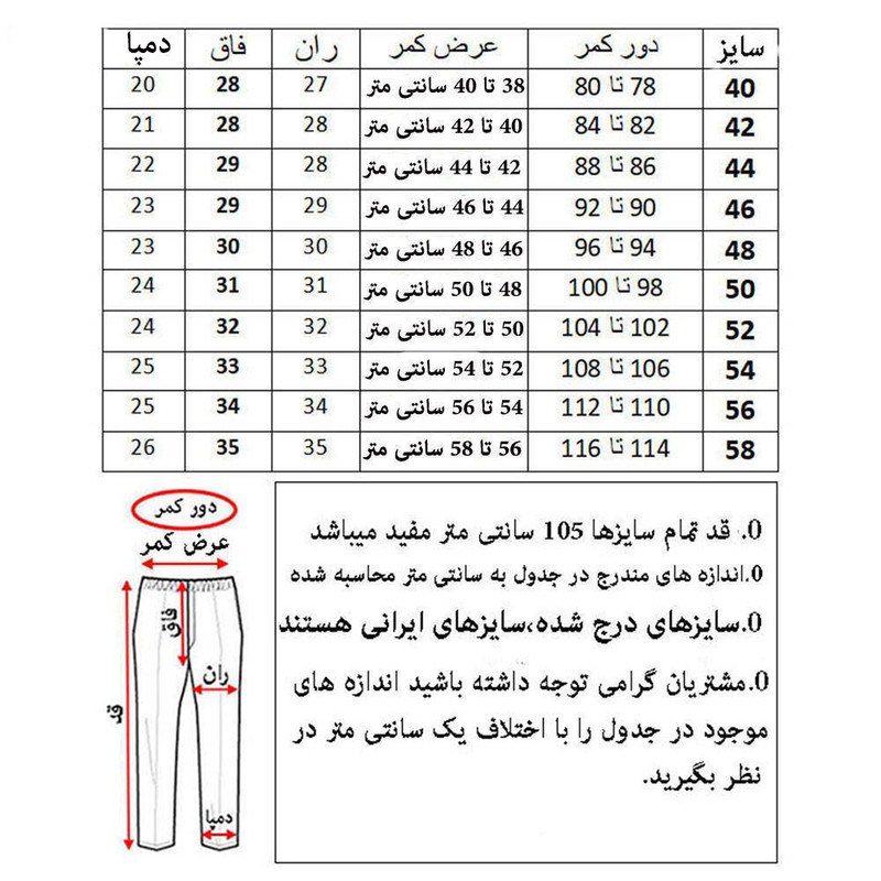 پارچه = فیلا فیلا دون دون تن خوری = کلاسیک خط اتو = دارد بسته شدن فاق = زیپ دارای 3 جیب راهنمای انتخاب سایز در قسمت تصاویر خواهشمندیم در هنگام ثبت سفارش به انتخاب فروشنده دیان دقت نمایید.