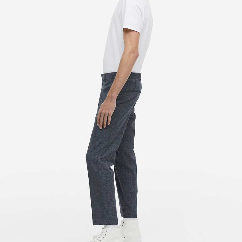 شلوار پارچه ای مردانه با زیپ که دارای قلاب و دکمه پنهان است. تناسب باریک با جیبهای کناری، جیبهای پشتی
