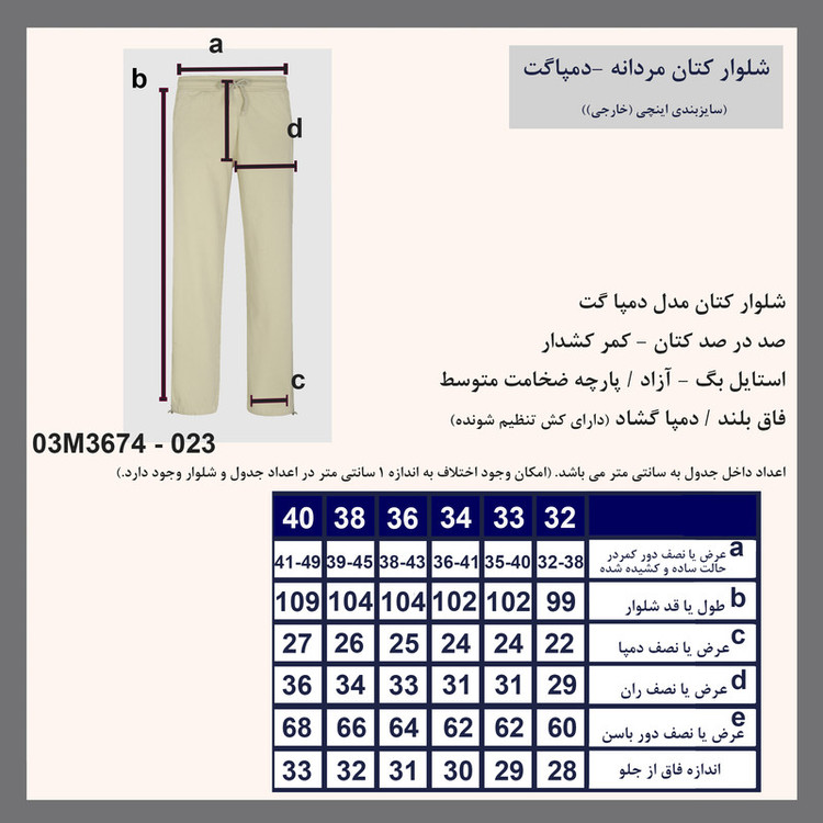 شلوار کتان بگی / جنس : صد در صد کتان (پنبه) / ضخامت متوسط / دمپا گشاد (دارای بند تنظیم شونده) فاق متوسط ، بلند / مدل با وزن 80 کیلوگرم قد 187 سانتی متر سایز 33 پوشیده است.
