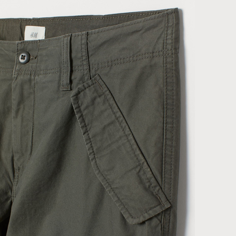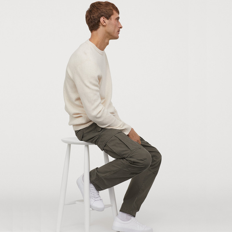شلوار پارچهای نخی با زیپ و دکمه و جیبهای کنار، پشت و دکمه های پرس مخفی. پاهای مخروطی با درز در زانو.