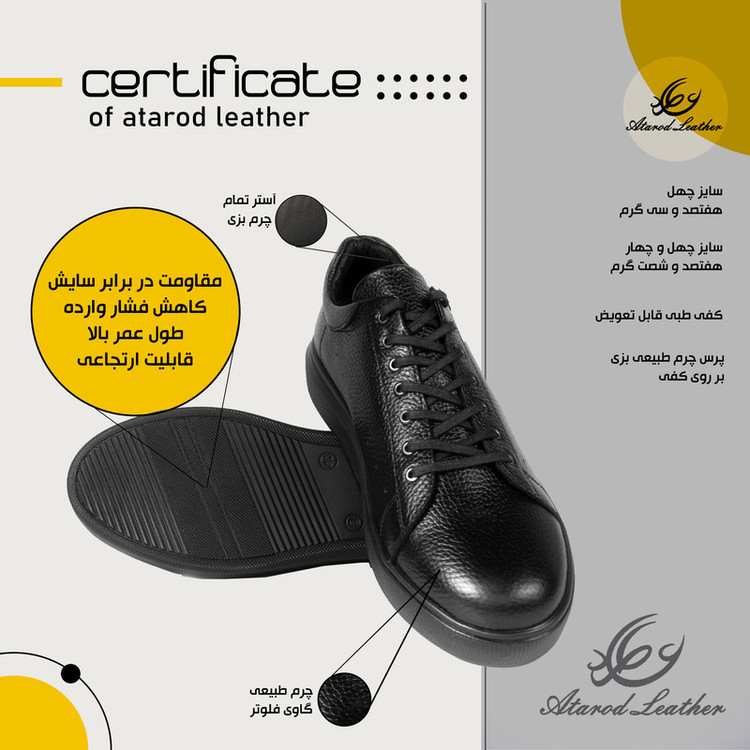 جزئیات: با توجه به تمام چرم طبیعی بودن کفش میتوانید از واکس بی رنگ جهت نگهداری بهتر از کفش چرم طبیعی برند عطارد استفاده کنید.