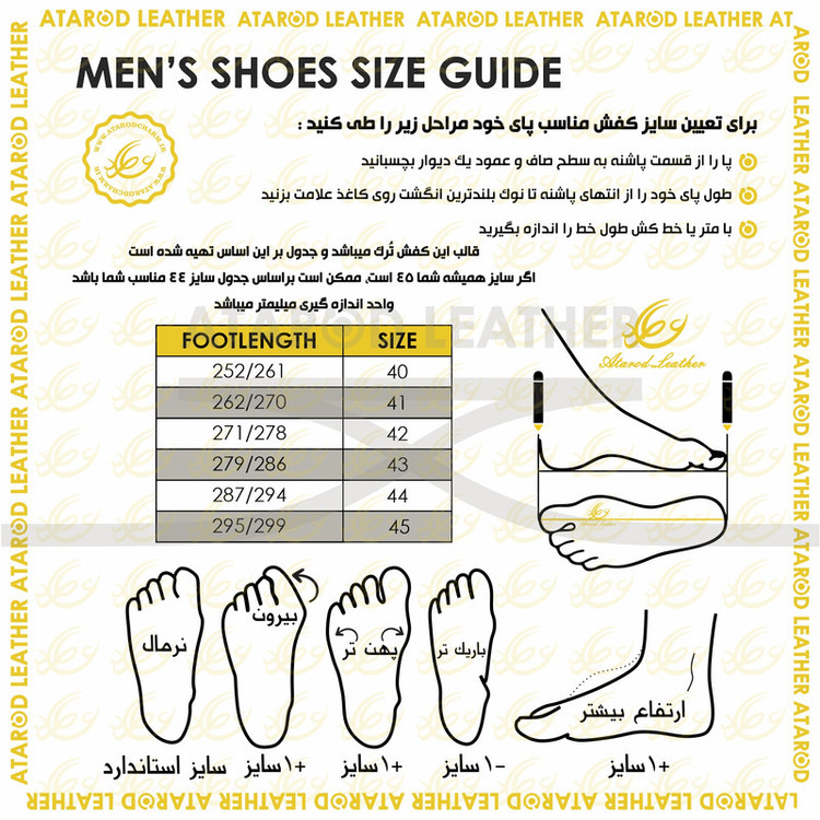 رویه کفش چرم طبیعی لوکس گاوی برند ثبت شده عطارد آستر داخل کفش چرم طبیعی بزی لوکس زیره لوکس پاشنه تا پنجه ، بیرون و داخل تمام چرم طبیعی چرم عطارد لطفا توجه داشته باشید قالب این کفش تُرک و بزرگ پا میباشد و حتما براساس جدول سایز بندی سفارش دهید
