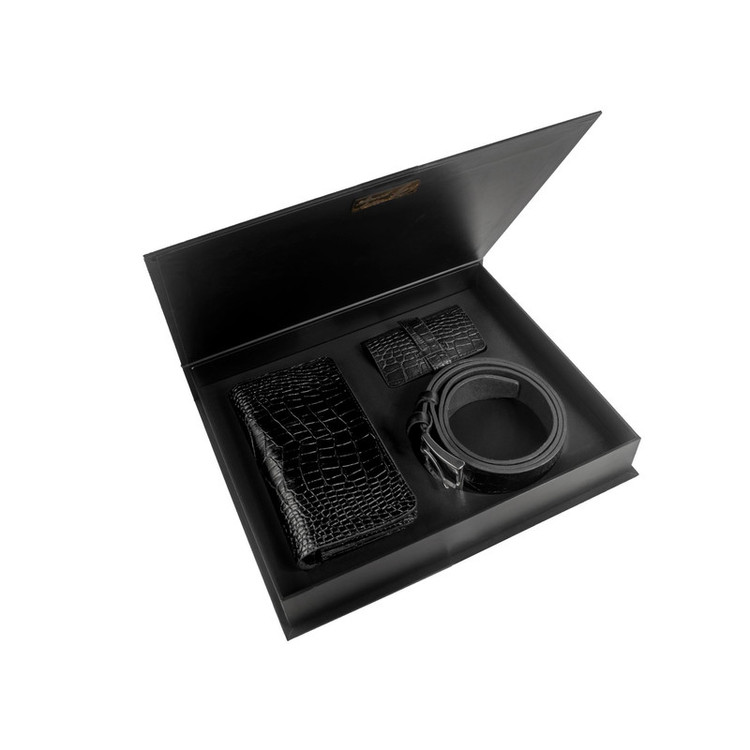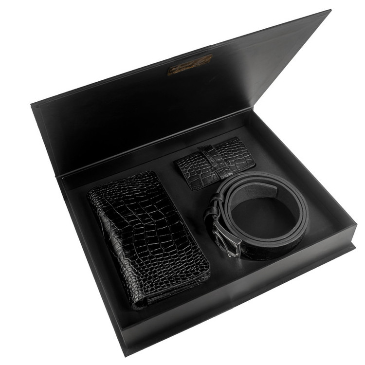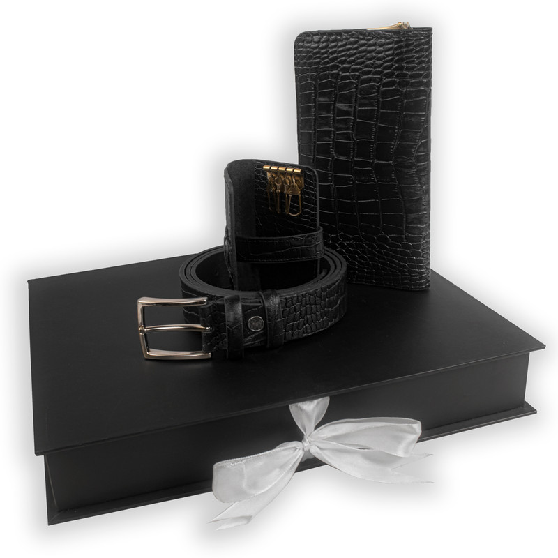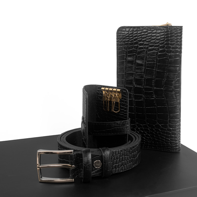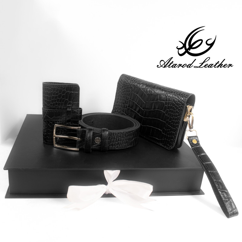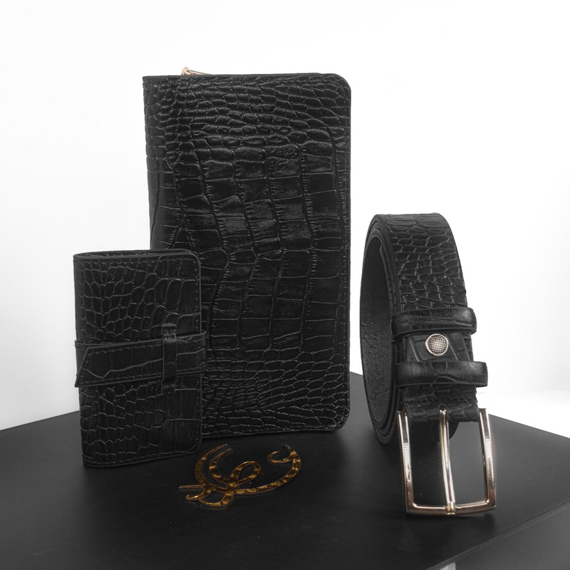 ست هدیه 3 تکه شامل کمربند (چرم طبیعی گاومیش طرح کروکودیل) ، کیف پول دستی و جاکلیدی آویز (چرم طبیعی گاوی طرح کروکودیل)