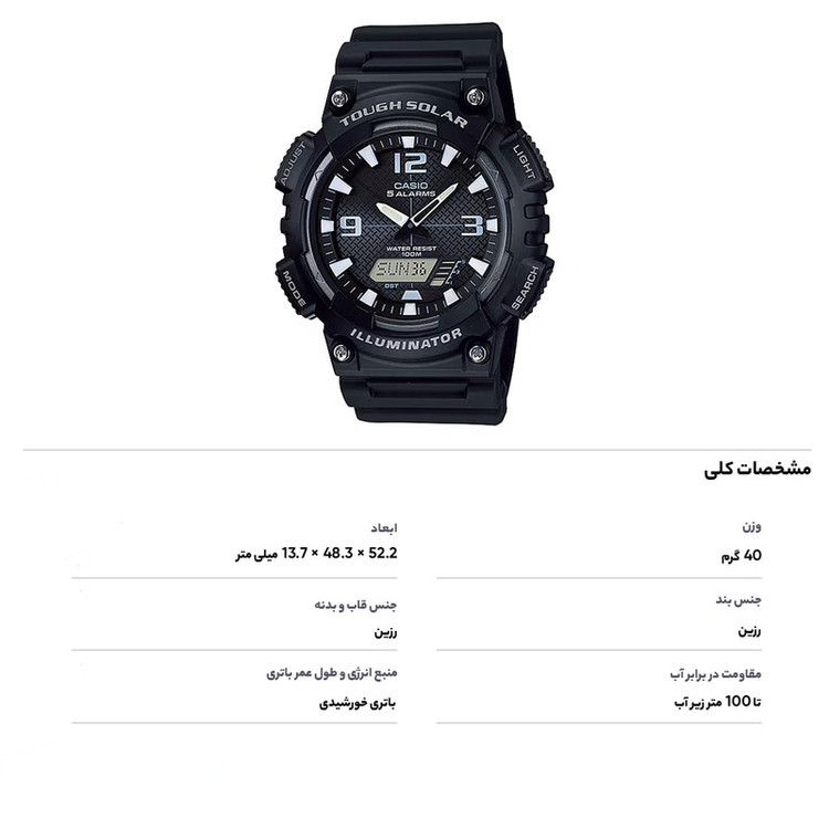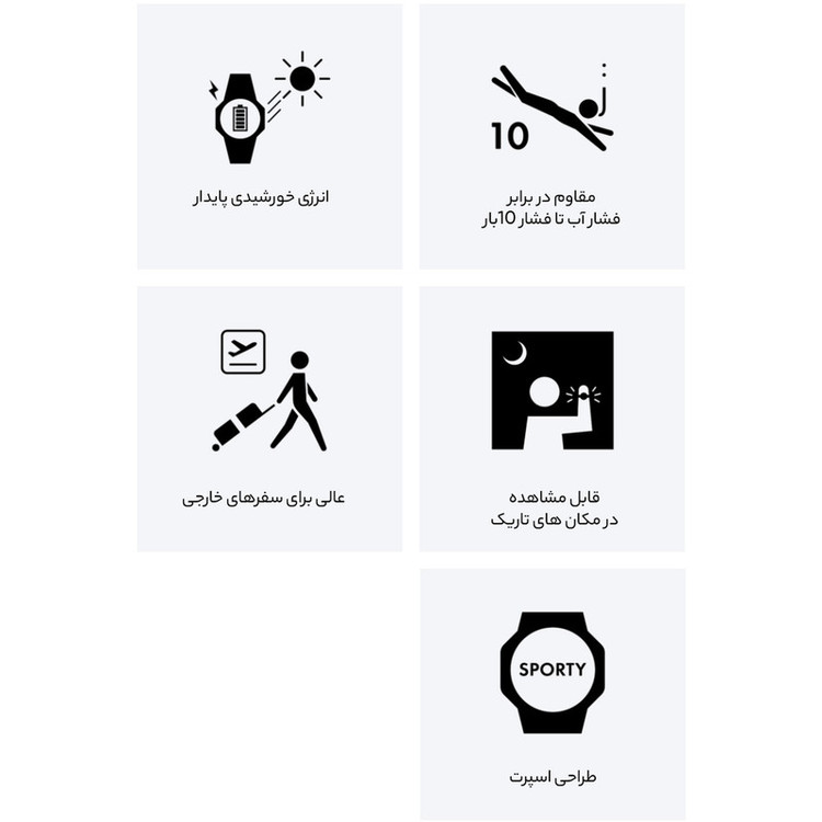 تایمر , عقربههای شبتاب , نمایش 24 ساعته , نور پسزمینه , تاریخشمار , آلارم , کرنوگراف , ضدآب