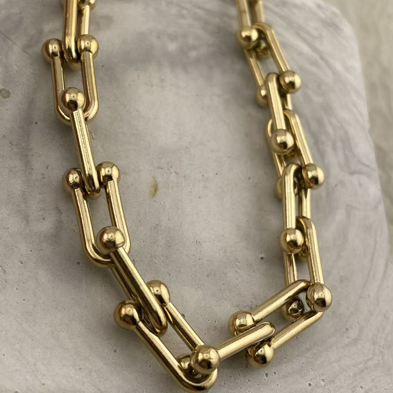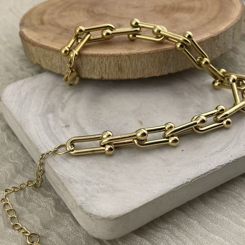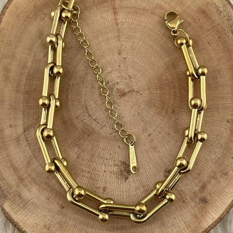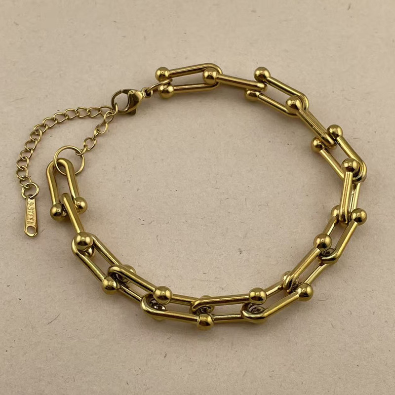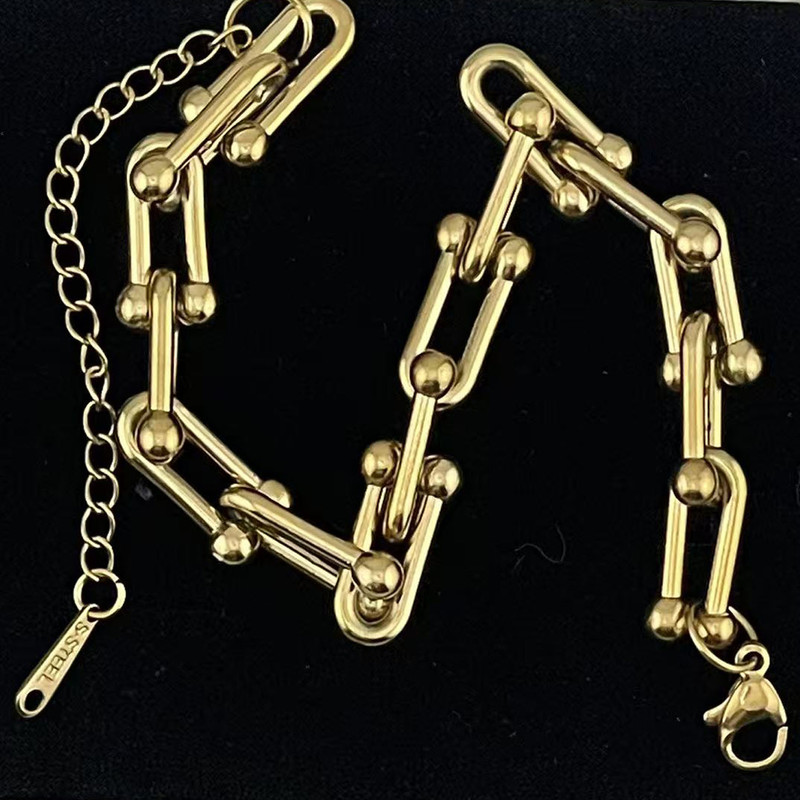 دستبند استیل با طرح محبوب و ترند تیفانی (U) که با آبکاری طلایی و درخشش فوقالعادهاش، جلوهای لوکس به استایل شما میبخشد.