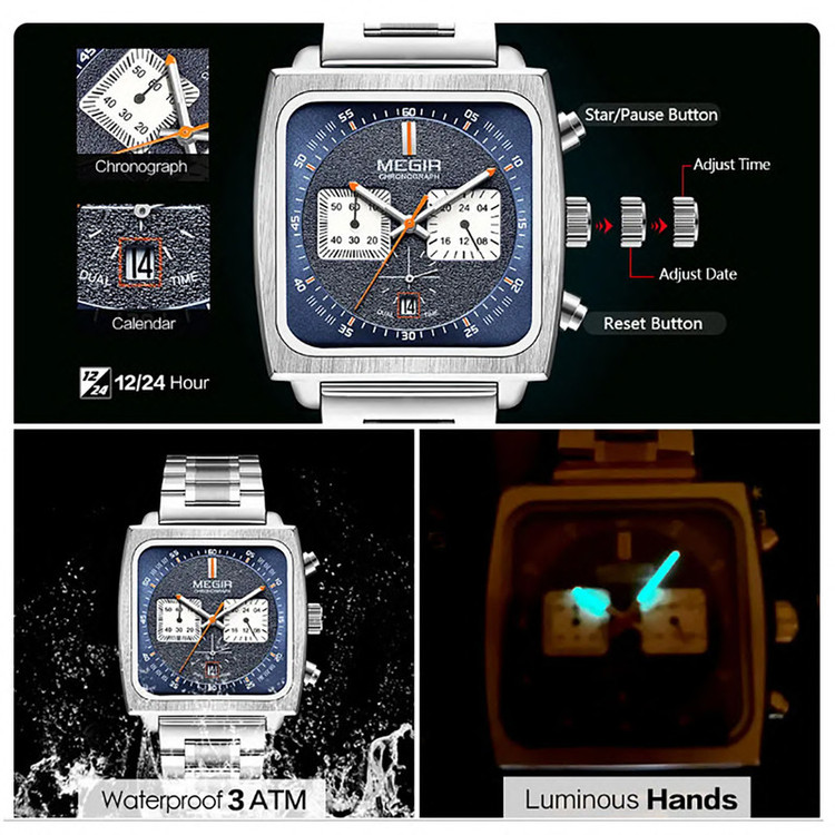 نمایش 24 ساعته , تاریخشمار , صفحه طرحدار , عقربههای شبتاب , شیشه ضدخش , کرنوگراف