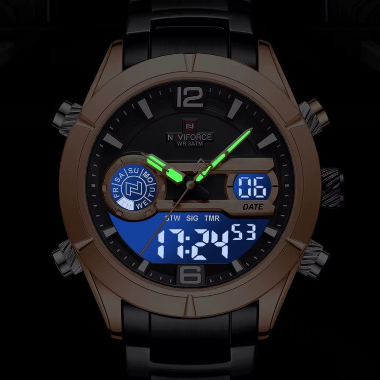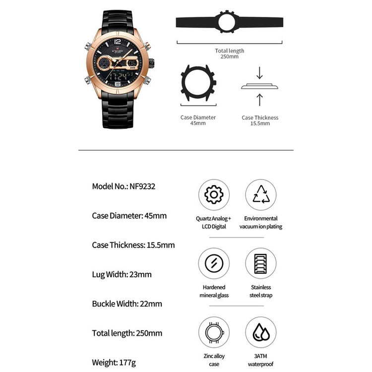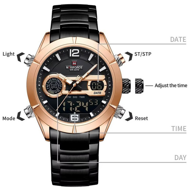 قابلیتهای تخصصی ساعت : تایمر , عقربههای شبتاب , نمایش 24 ساعته , نمایش ساعت دوم , نور پسزمینه , تاریخشمار , آلارم , شیشه ضدخش , کرنوگراف , ضدآب