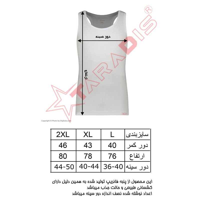رکابی فانریپ پنبه سوپر تارادیس از الیاف طبیعی و ضد حساسیت تولید شده است و براي سلامتي پوست اقايان نقش بسزايي دارد.زيرپوش پنبه اي باعث جذب حداکثري تعريق بدن مي شود و امکان باقي ماندن رطوبت و ايجاد ناراحتي و حساسيت پوستي رابه حداقل ميرساند و در برش و دوخت فاصله بين رکاب ها رعايت شده در صورت استفاده کردن از تيشرت يا پيراهن رکاب ها از کنار ديده نميشود و حالت يقه باز مناسب براي زير پيراهن مردانه هست و اما پارچه هاي رنگي تاراديس در رنگرزي هاي معتبر ايران با رنگهاي اکتيو و با کمترين ضرر براي پوست تکميل ميشود (انچه در ذهن شماست دستور کار ماست)