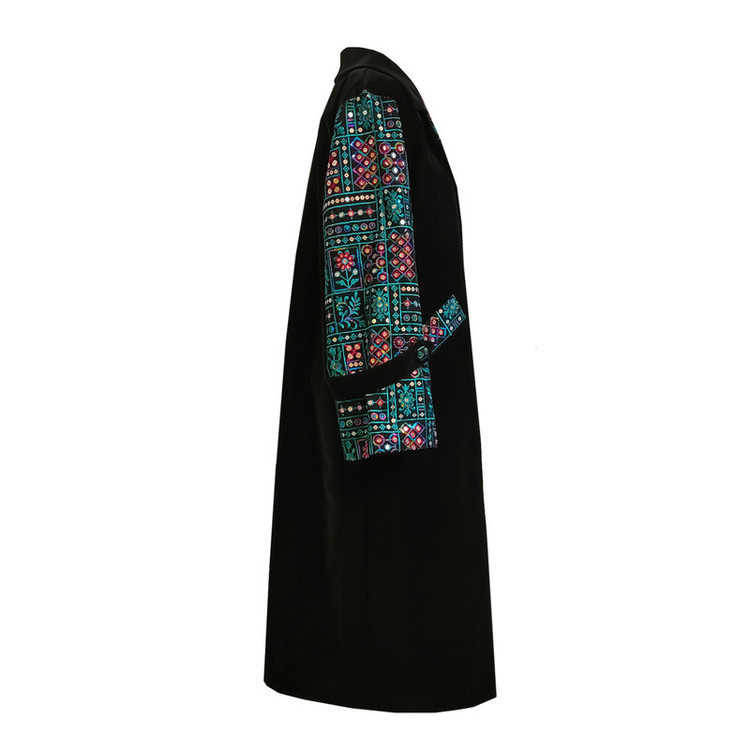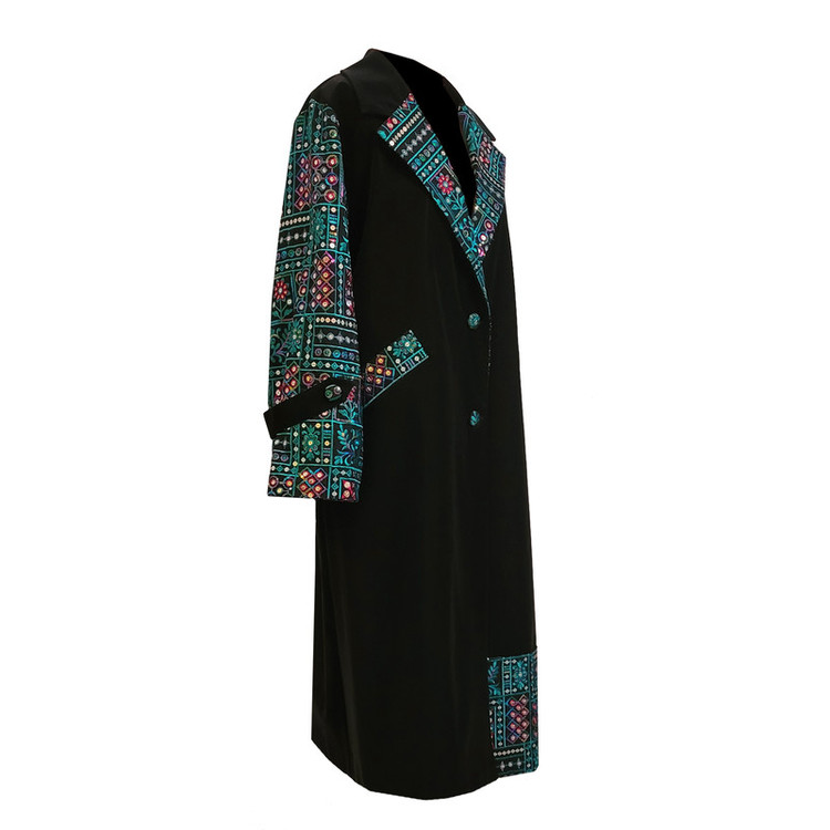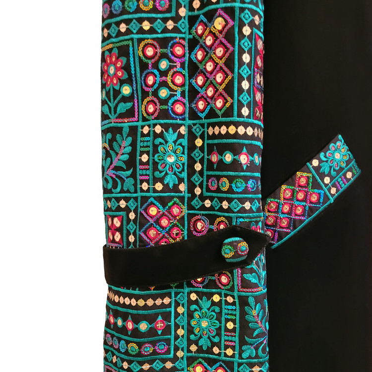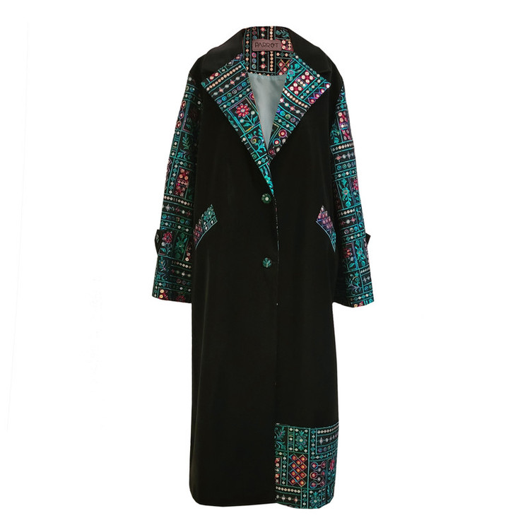 پارچه این پالتو از جنس چرم مصنوعی ایتالیایی و سوزندوزی هندی تهیه شده است . دارای آستر است و دوخت آن به صورت تکدوزی و بسیار تمیز می باشد . مناسب فصل زمستان . قد پالتو 120 . دور سینه 106 . مدل تنخور لباس آزاد می باشد