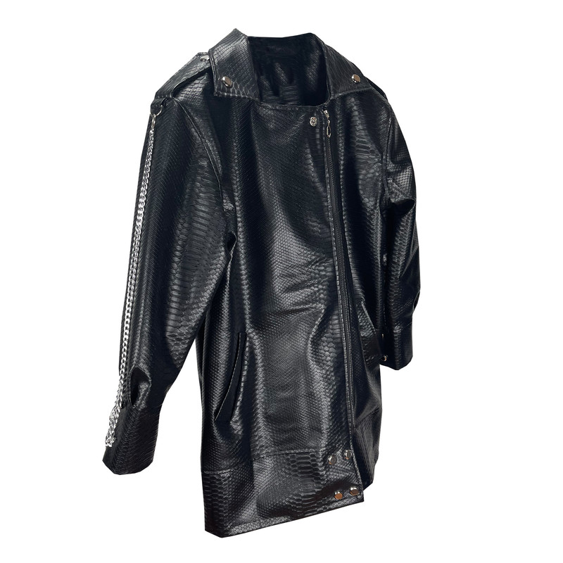 این کت زنانه از چرم ضخیم پوست ماری (دراگون) با کیفیت دوخته شده است داخل این کت آستر کشی شده است که به هیچ عنوان در طول سالها استفاده پوسته پوسته نخواهد شد. دکمه های این محصول از جنس فلزی انتخاب شده است. جلوی کت با زیپ بسته میشود. روی آستین راست کت برای اسپرت دیده شدن زنجیری بکار رفته است که در صورت نیاز قابل جدا شدن است.