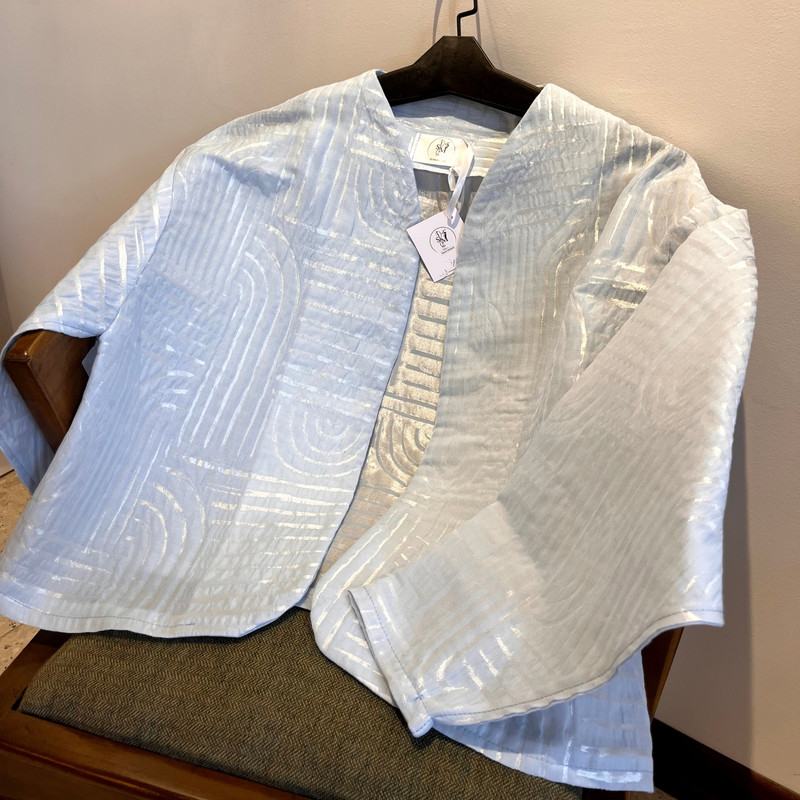 کت تک زنانه با جنس ژاکارد ،مناسب میهمانی و اجتماع میباشد،قد این کار 65 cm و مدل آستین ها و کت آزاد و فری میباشد ،از سایز 38 تا 42 .مدل آستین ها خمره ای و یقه هفت ساده میباشد