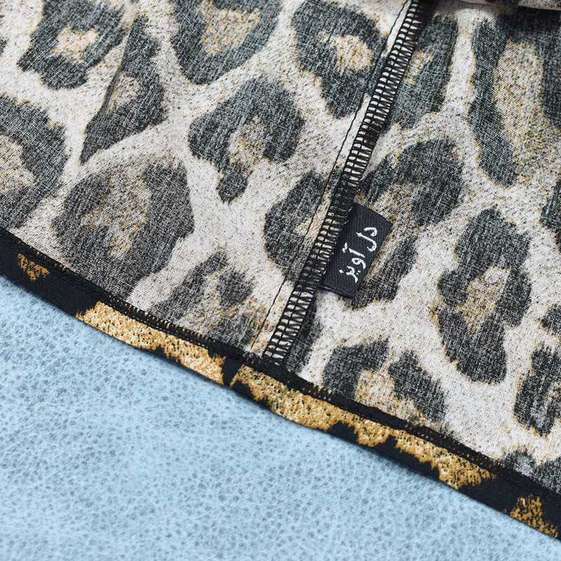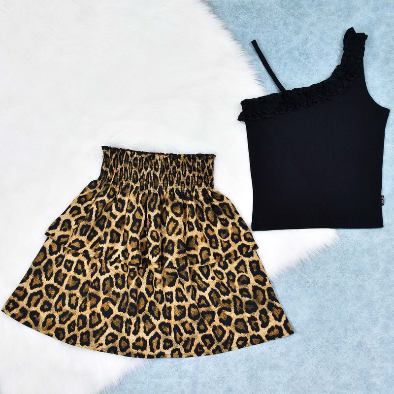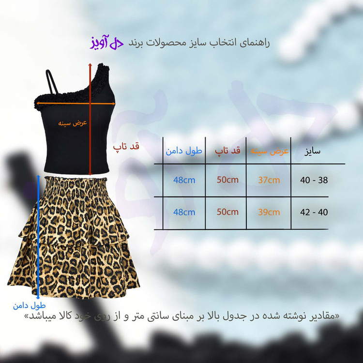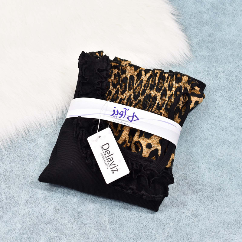تاپ مشکی با طرح یقه رومی چین دار با جنس پنبه صد در صد و بافت نرم، دامن مدل دو طبقه کمر کشدوزی عریض با طرح لئوپارد(پلنگی) با جنس تمام نخ(هر دو تکه ست کاملا نخ و پنبه بوده بدون هیچ درصدی از مواد پلی استر)