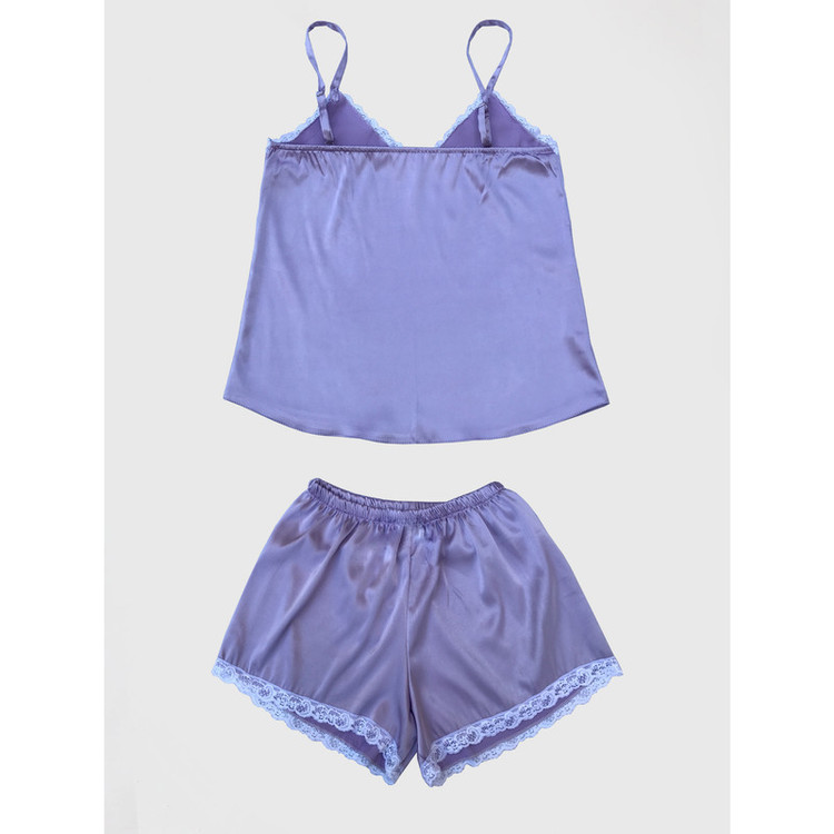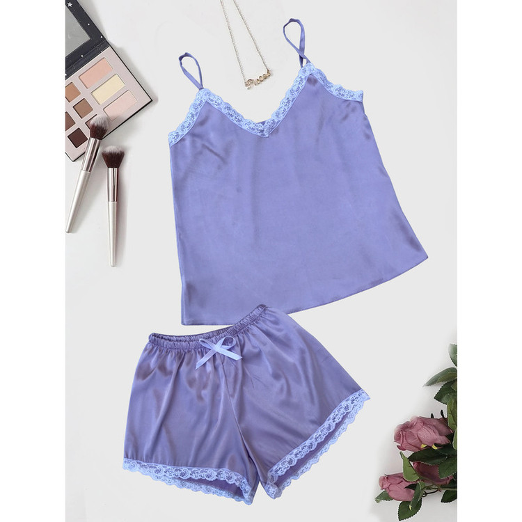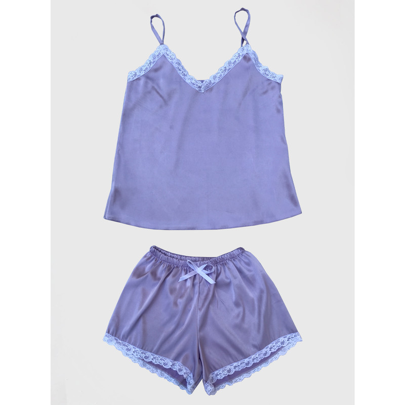 - لباس خواب زنانه شامل تاپ ساتن آستین حلقه ای یقه هفت و شلوارک ساتن