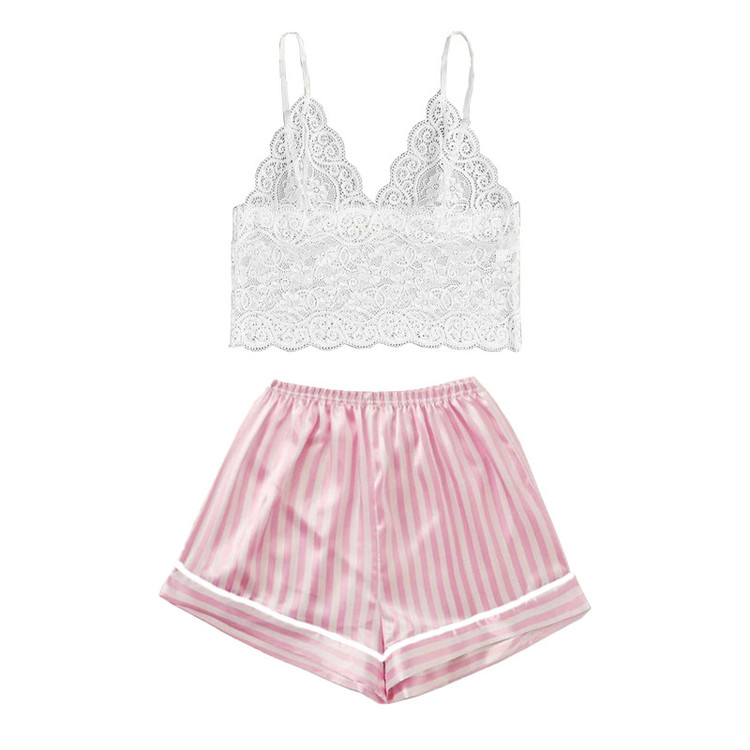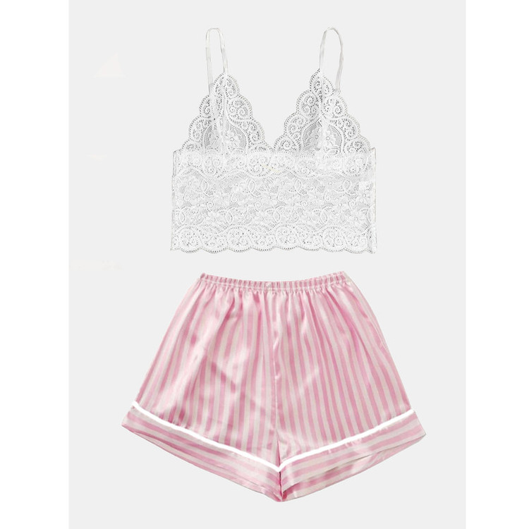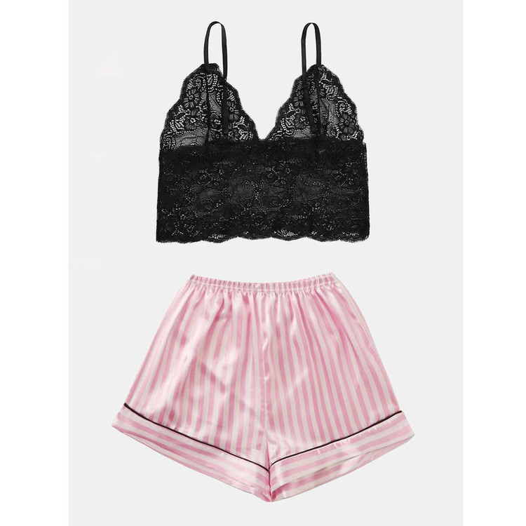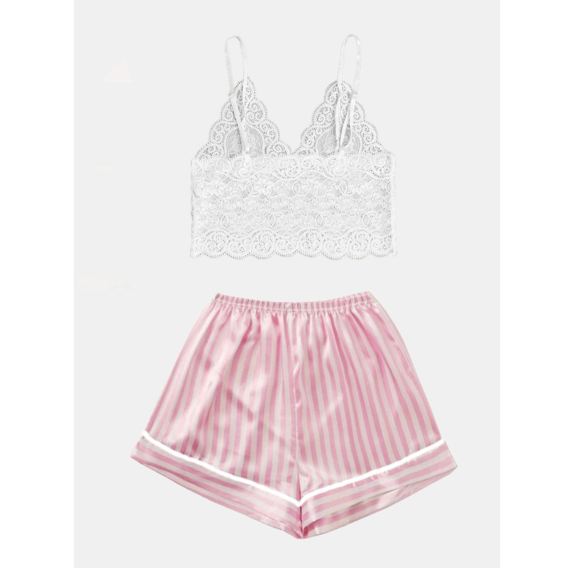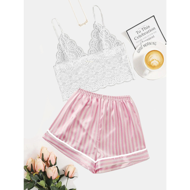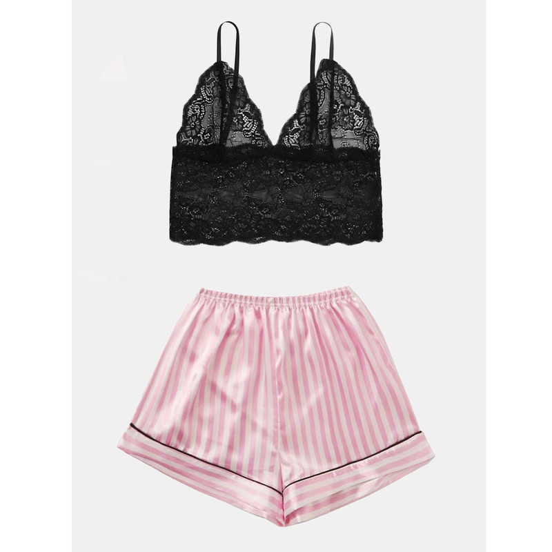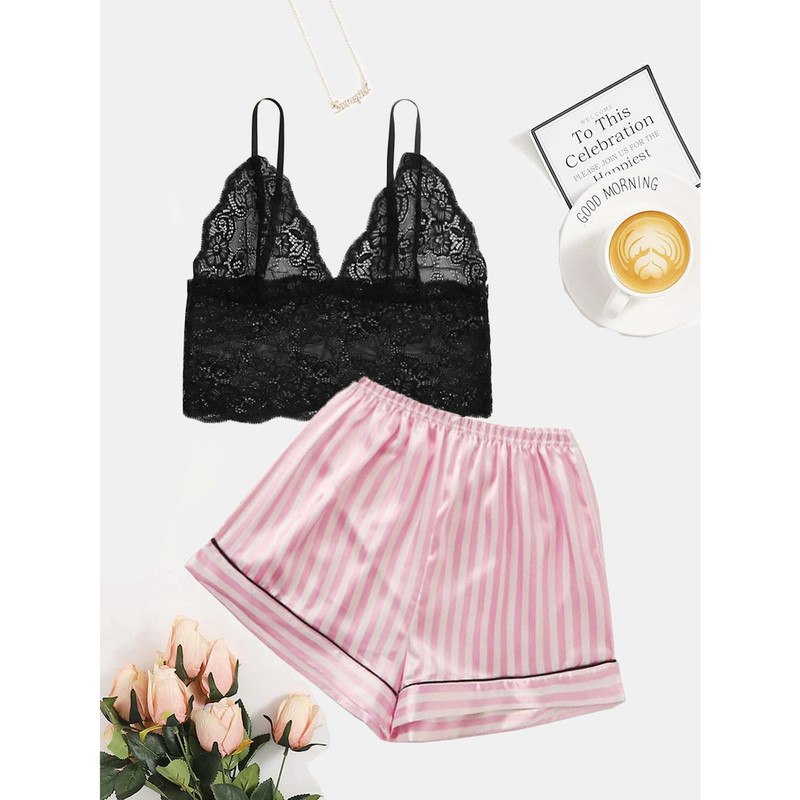 ست لباس خواب زنانه شامل شلوارک ساتن طرح دار و نیم تنه گیپور