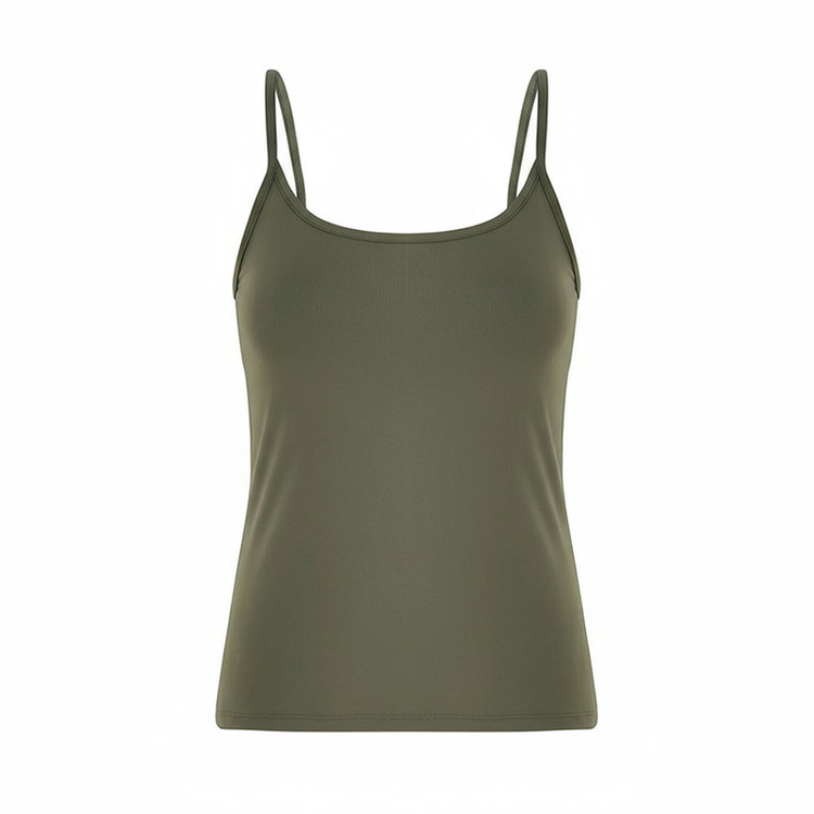 _ برند: اسمارا (esmara) _ جنس: نخی (Cotton Blend) _ رنگ: سبز زیتونی _ طراحی: تاپ بندی (Camisole) با بندهای نازک _ تنخور: استاندارد (Regular Fit) تا نیمه جذب _ ویژگیهای مهم: تنفسپذیر، نرم و راحت _ کاربرد: زیرپوش، لباس راحتی و کژوال