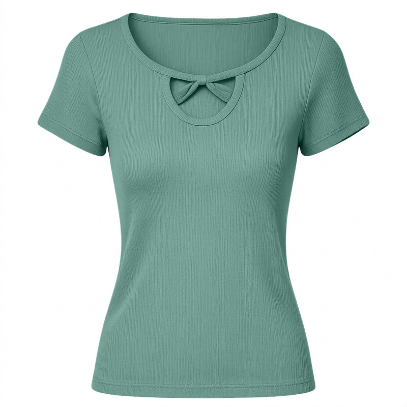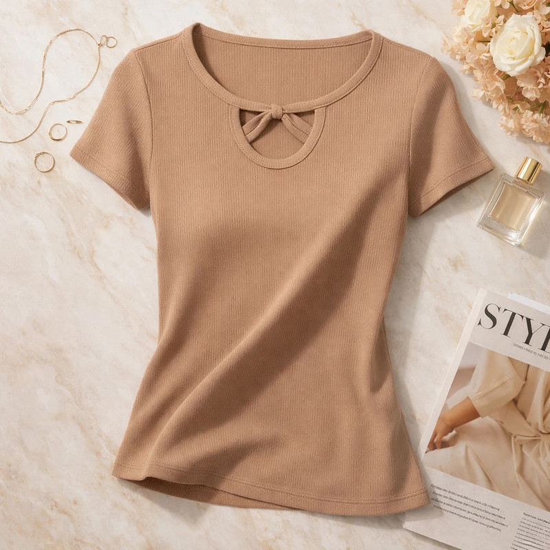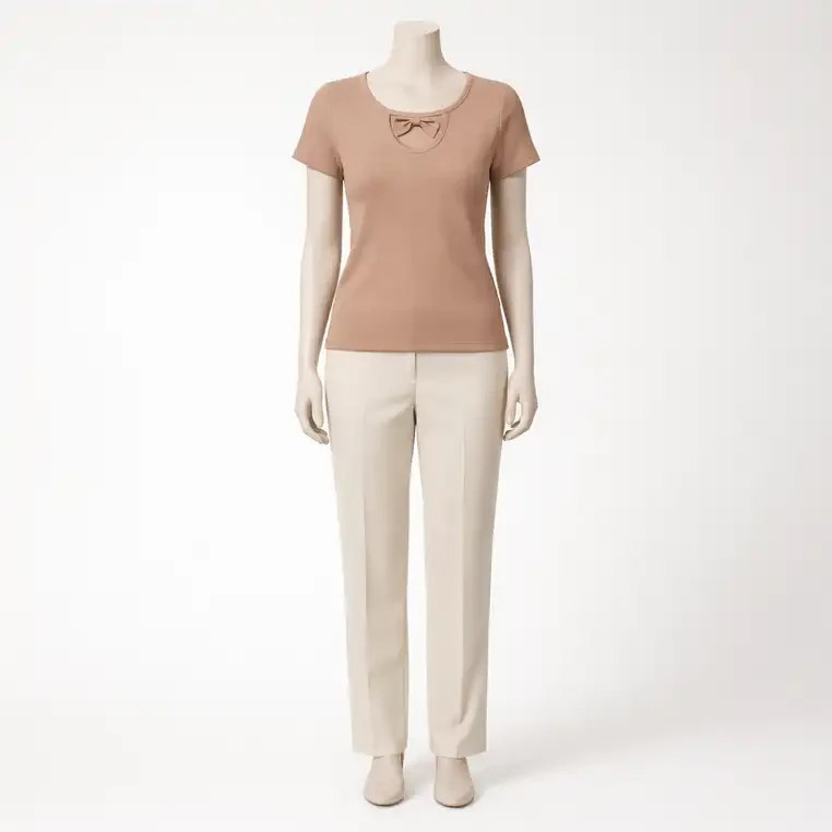 یقه پاپیونی این مدل جلوهای متفاوت و ظریف به لباس داده و ظاهر آن را از یک تیشرت ساده متمایز میکند. در دوخت این محصول از تکنیک دو سوزنه استفاده شده است که به افزایش استحکام درزها کمک میکند و باعث میشود لباس در استفاده روزمره دوام مناسبی داشته باشد.