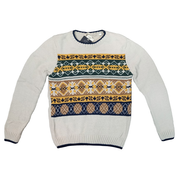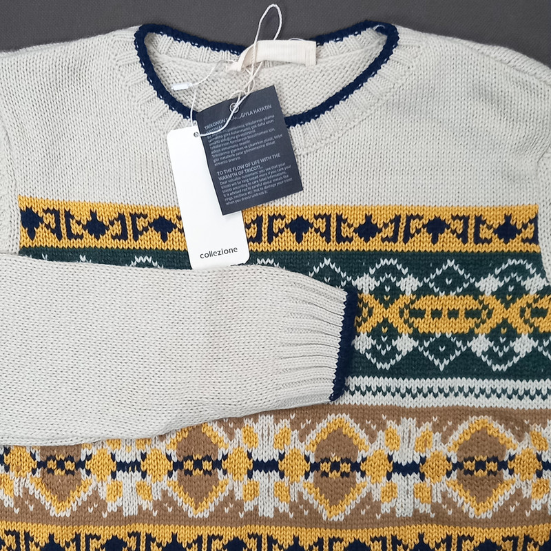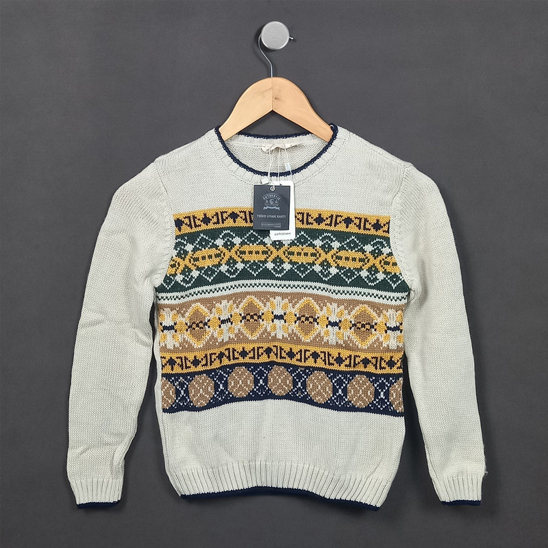این پلیور رنگ استخوانی روشن با ترکیب رنگ سرمه ای و خردلی و یشمی است که آن را به راحتی میتوانید با یک شلوار جین یا کتان سرمه ای یا کرم یا خردلی ست کنید .