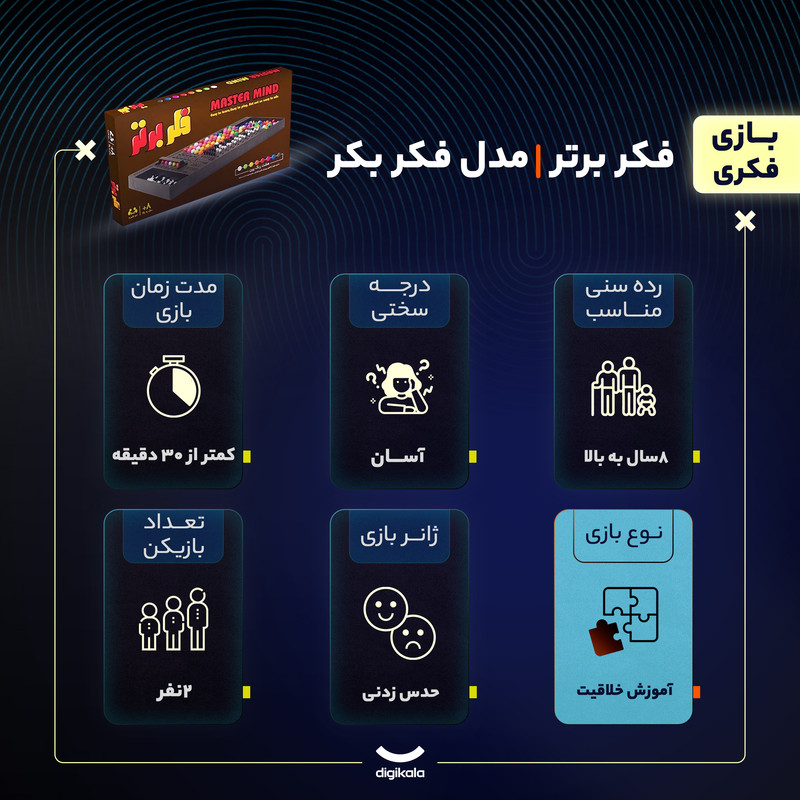 حریف پنج مهره را پشت دیواره مخصوصی پنهان کرده است و شما باید در کمتر از دوازده دوره حدس زدن و چیدمان 5 مهره حریف را به دست آورید. نفر اول 5 مهره را به انتخاب خود در فضای مخصوصی چیده و دیواره را جلوی آنها قرار میدهد تا مخفی بماند. ترکیب رنگها میتواند به دلخواه انتخاب شود. نفر دوم باید ترکیب رنگی حریف را حدس زده و 5 مهره را در قسمت مخصوص دوره اول قرار دهد. بازیکن اول بر اساس چیدمان نفر دوم به او امتیاز میدهد. رنگ سیاه نشان دهنده رنگ و موقعیت در صفحه مهره و رنگ سفید نشان دهنده این است که رنگ مورد نظر در جایگاه است ولی باید جای آن تغییر کند. این یک بازی کاملا استراتژیک است و باعث افزایش قدرت تحلیل و واکاوی و حدس و گمان در بازیکن خواهد شد.