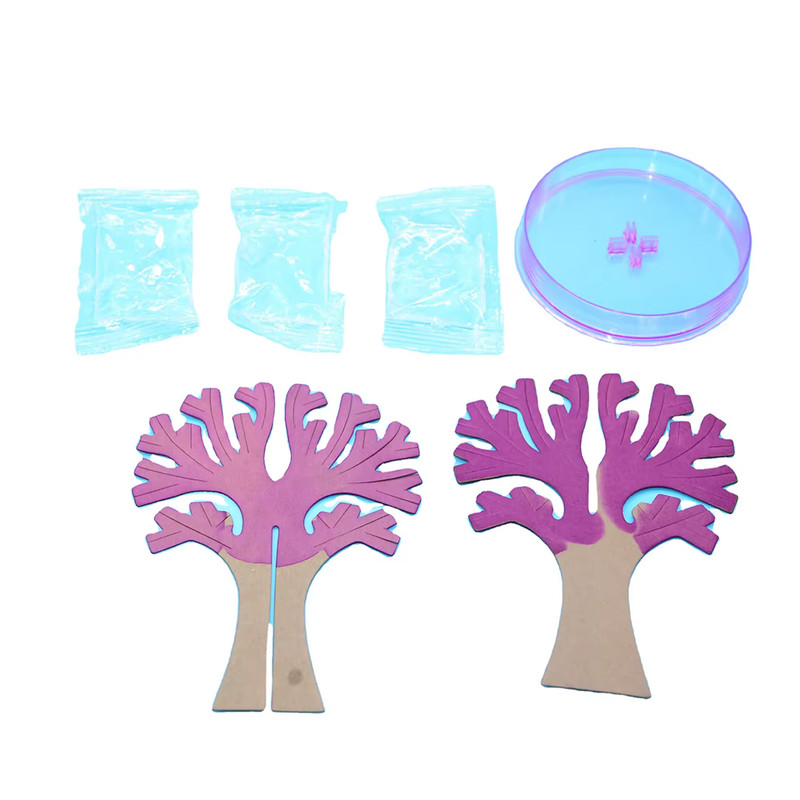 3 کیسه محلول نمک جادویی، 2 نیمه درخت کاغذی و یک ظرف پلاستیکی