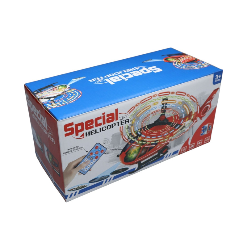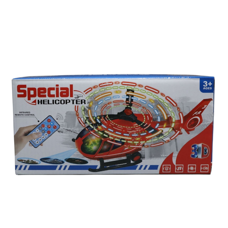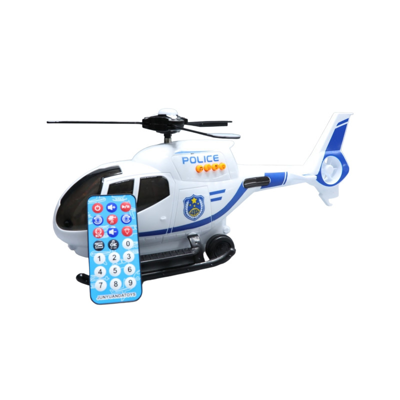کنترل هلیکوپتر دارای دکمههایی برای روشن و خاموش کردن، تغییر جهت، تنظیم صدا، قطع صدا، تنظیم میزان نور (از زیاد تا خاموش)، آمادهبهکار کردن دستگاه، پخش موسیقی (با هر بار فشردن دکمه، موسیقی بعدی پخش میشود)، پخش صدای چند مدل هلیکوپتر و بیان اعداد ۰ تا ۹ به زبان انگلیسی است. این اسباببازی ۲۰ موزیک شاد دارد که با فشردن عدد مورد نظر و سپس دکمه OK، موزیک انتخابی پخش میشود.