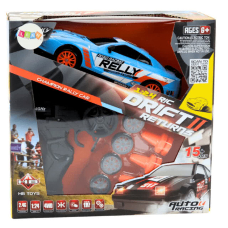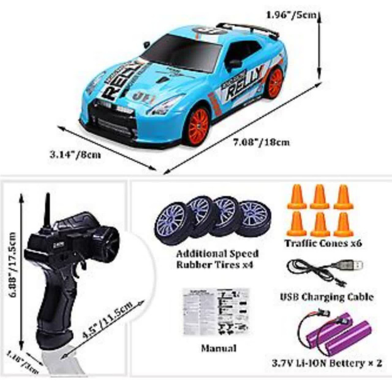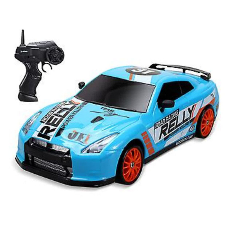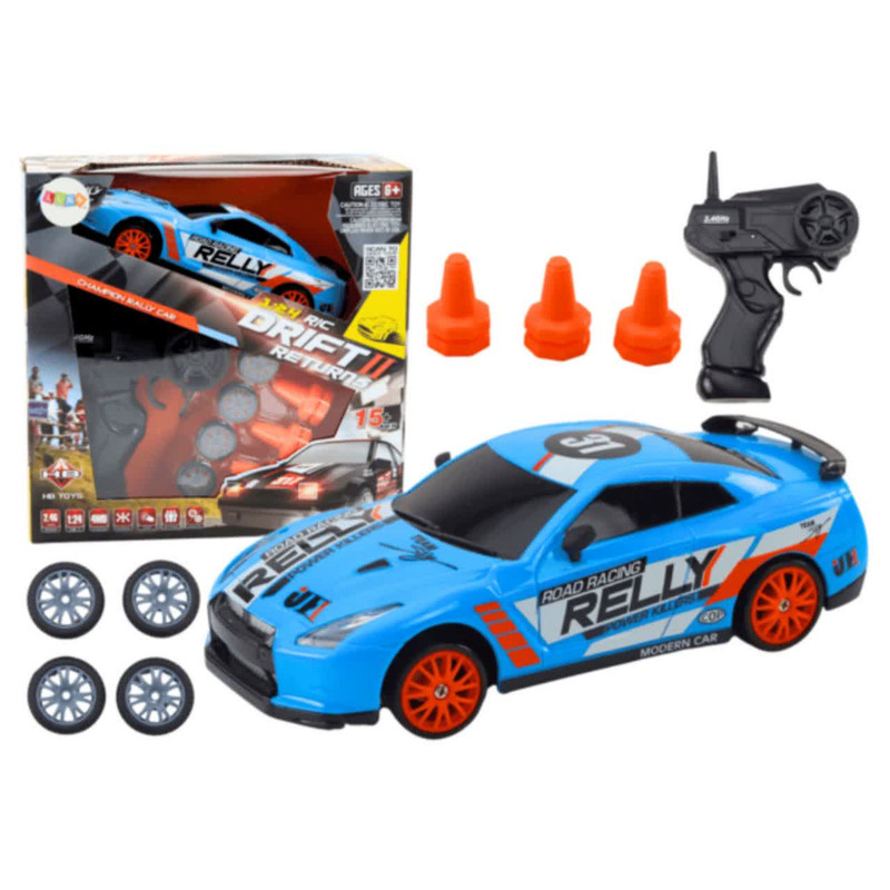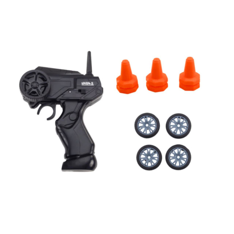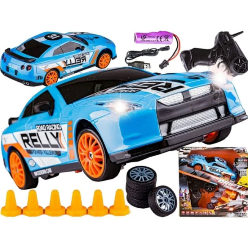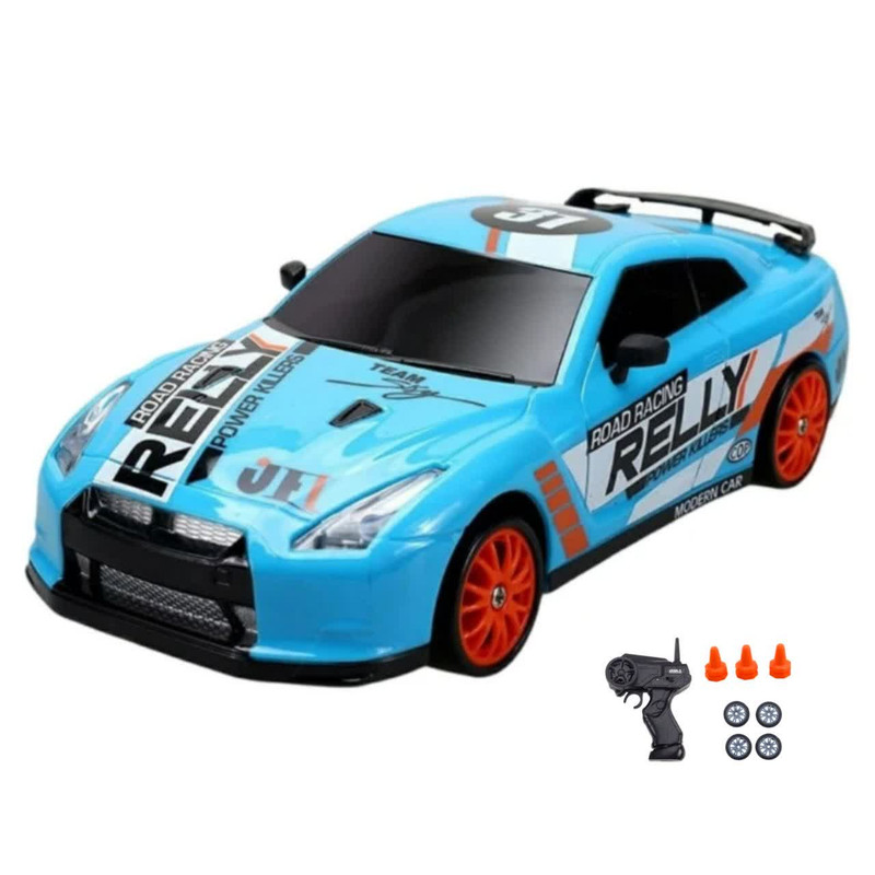 ماشین بازی کنترلی ناب سل مدل نیسان اسکایلاین اسپرت دریفت شارژی سرعتی 15km/h به همراه لاستیک زاپاس و علائم رانندگی کد NISSAN SKYLINE DRIFT CAR RETURNS NAAB005