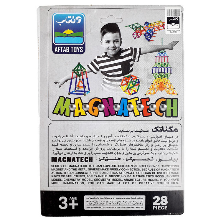 دارای 28 قطعه شامل 10 گوی فلزی استیل قطر یک سانت و 18 میله دوسر آهنربایی 3 سانتی در 4 رنگ