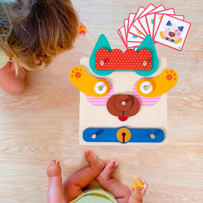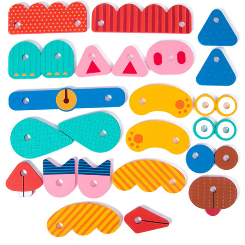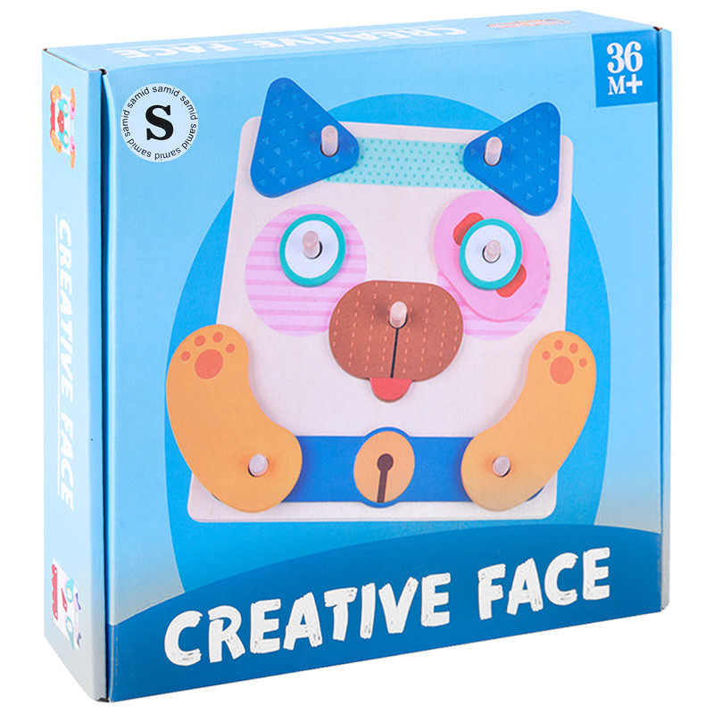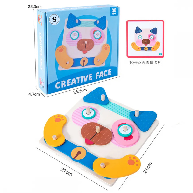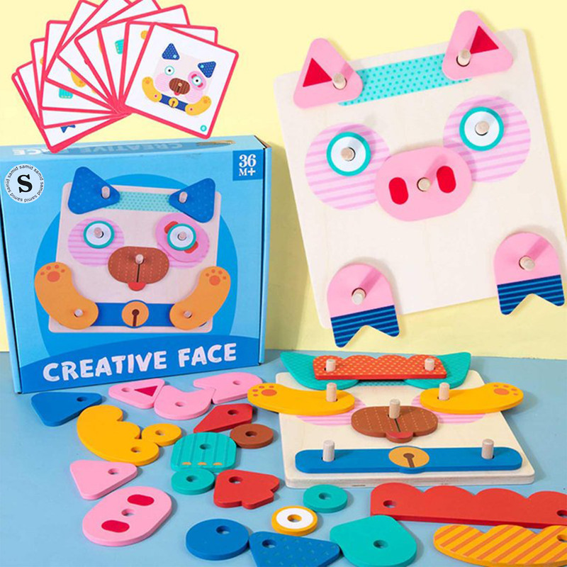 کودک قطعات چوبی مختلف را روی صفحه پایه قرار میدهد و با کمک پینها، چهرههای گوناگون میسازد. برای تمرین و چالش بیشتر، میتواند از روی فلشکارتهای تصویری نمونه داخل جعبه، چهرهها را بازسازی کند. هر بار بازی، نتیجهای جدید و خلاقانه دارد!