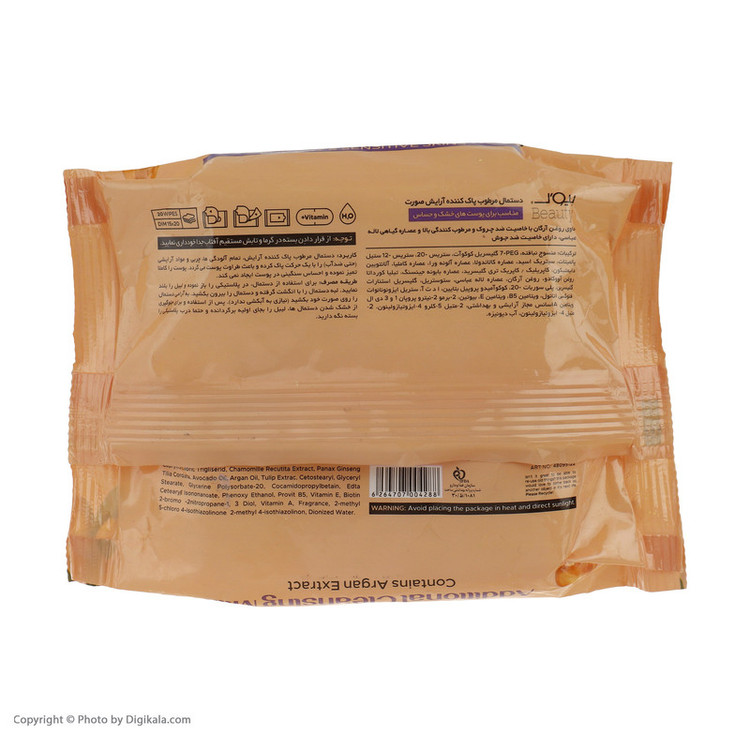 سایر مشخصات: دستمال مرطوب آرایشی مخصوص پوست های خشک و حساس حاوی آرگان و عصاره لاله عباسی ضد چروک، با شیرکرمی مضاعف