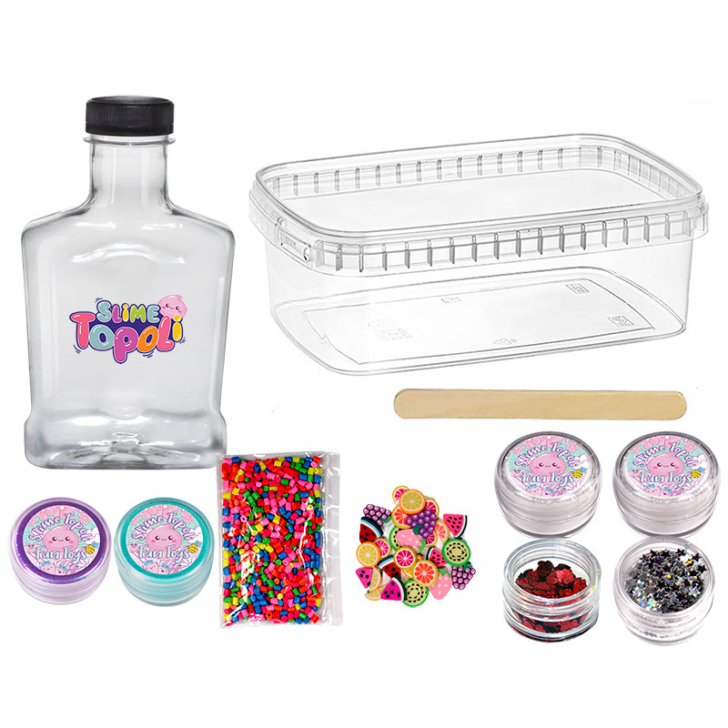 سه دفترچه راهنمای یک چسب شفاف یک ظرف 1000 میلی لیتری یک چوب بستنی یک بسته گرانول میوه یک بسته گرانول رنگی دو بسته پودر بوراکس دو بسته اکلیل دو بسته پودر رنگ متالیک سبز آبی و صورتی تیره