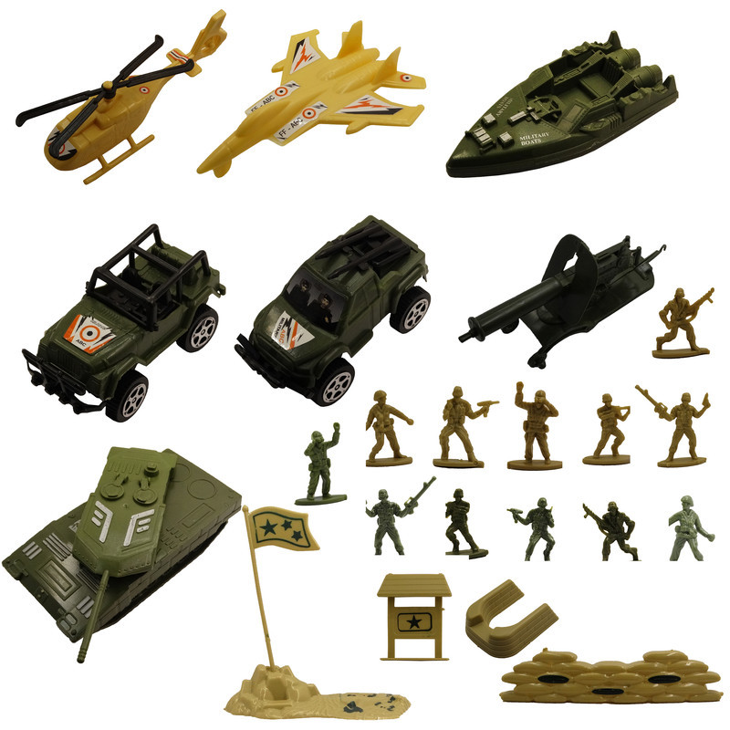 هلیکوپتر دو عدد ماشین نظامی یک هواپیمای جنگی یک عدد تانک یک عدد قایق نظامی سنگر و پرچم یک توپ جنگی ۱۲ عدد سرباز