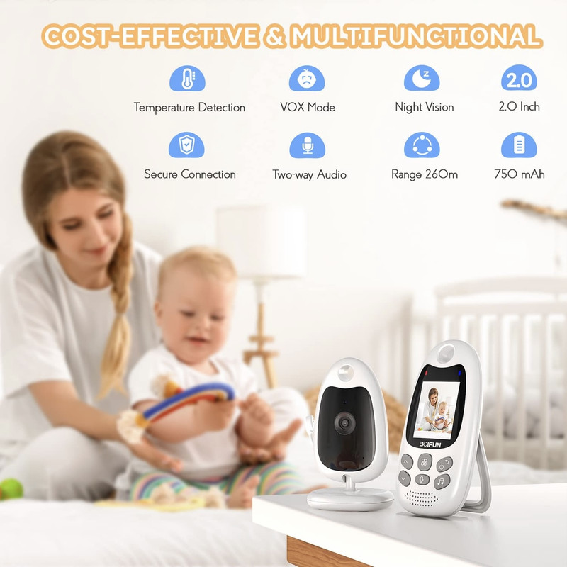 دوربین و مانیتور اتاق کودک بویفون دارای مانیتور ٢ اینچ می باشد. دید در شب، لالایی، تماس دو طرفه دارد.برد ٢۶٠ متر دارد.دارای سنسور حرارتی می باشد. آلارم گریه کودک دارد.سفارش ساخت کشور انگلیس است.