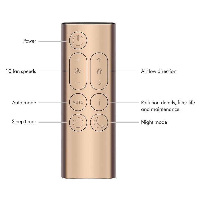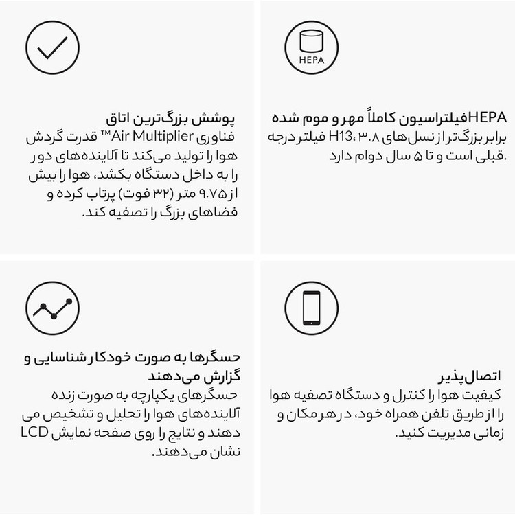 انواع سیستم های کنترل: - کنترل از راه دور - کنترل از روی صحه نمایش LCD روی دستگاه - از طریق برنامه موبایل MyDyson - کنترل از طریق صوتی با کمک هوش های مصنوعی Amazon Alexa / Apple Siri / Google Assist /