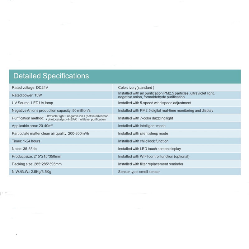 فیلتر اولیه (Pre-Filter) فیلتر HEPA فیلتر کربن فعال و در کنار آن: • لامپ UV برای استریلسازی هوا • یونساز (Anion) برای بهبود کیفیت هوا