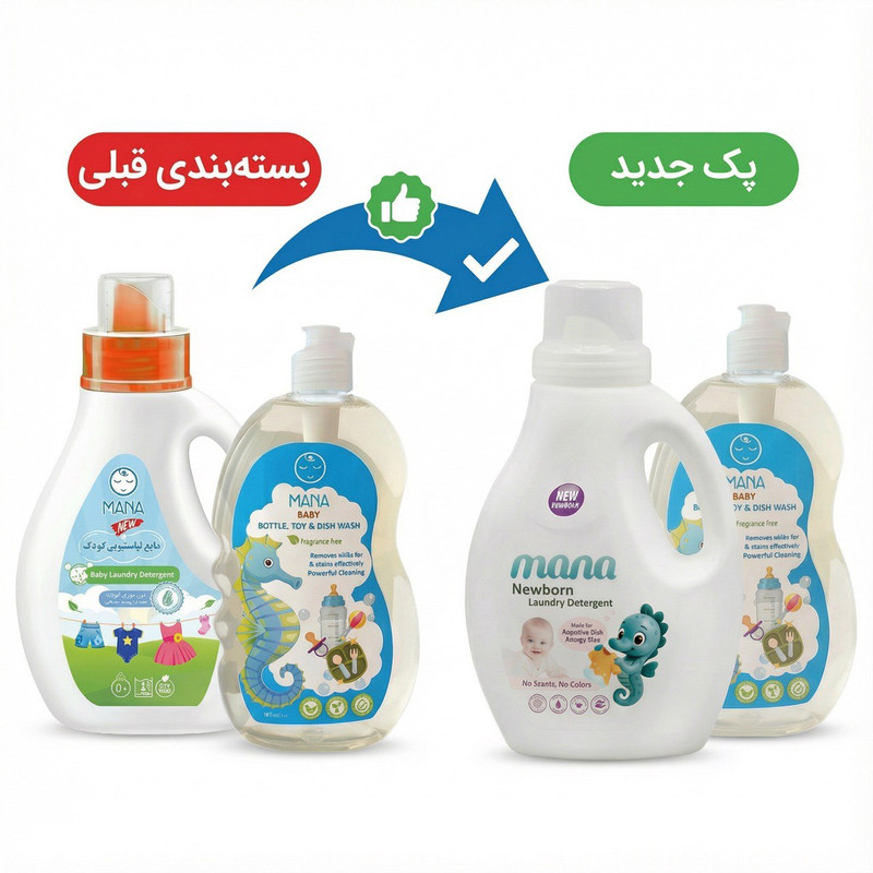 پک بهداشتی نوزادی مانا که شامل یک عدد مایع شوینده و استریل کننده شیشه شیر مانا به همراه مایع لباس شویی تخصصی نوزاد می باشد. که هردو محصول بدون اسانس و بدون رنگ تخصصی برای نوزادان از بدو تولد و کودکان تولید شده است.